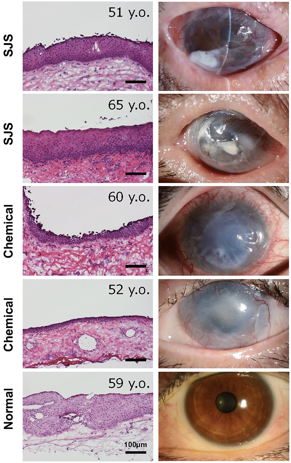 Conjunctival tissue samples were collected from two patients with Stevens-Johnson syndrome, two patients with chemical burns at the time of surgery, and one normal subject as a control. The surgeries took place at the University of Hospital, Kyoto Prefectural University of Medicine in Kyoto, Japan. The collected samples were immediately embedded in Tissue-Tek® O.C.T. Compound (Sakura Finetek Japan Co., Ltd, Tokyo, Japan) and cryopreserved at −80°C. The collection of samples followed the ethical guidelines outlined in the Declaration of Helsinki and was approved by the Research Ethics Committee of Kyoto Prefectural University of Medicine (#ERB-C-1522). The tissue samples were fixed in 4% paraformaldehyde, stained with Meyer’s hematoxylin and eosin solution, dehydrated, and immersed in xylene as previously reported [26], and images were captured using a microscope (DP80 TRF; Olympus Corp., Tokyo, Japan).