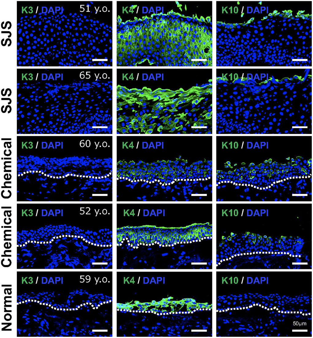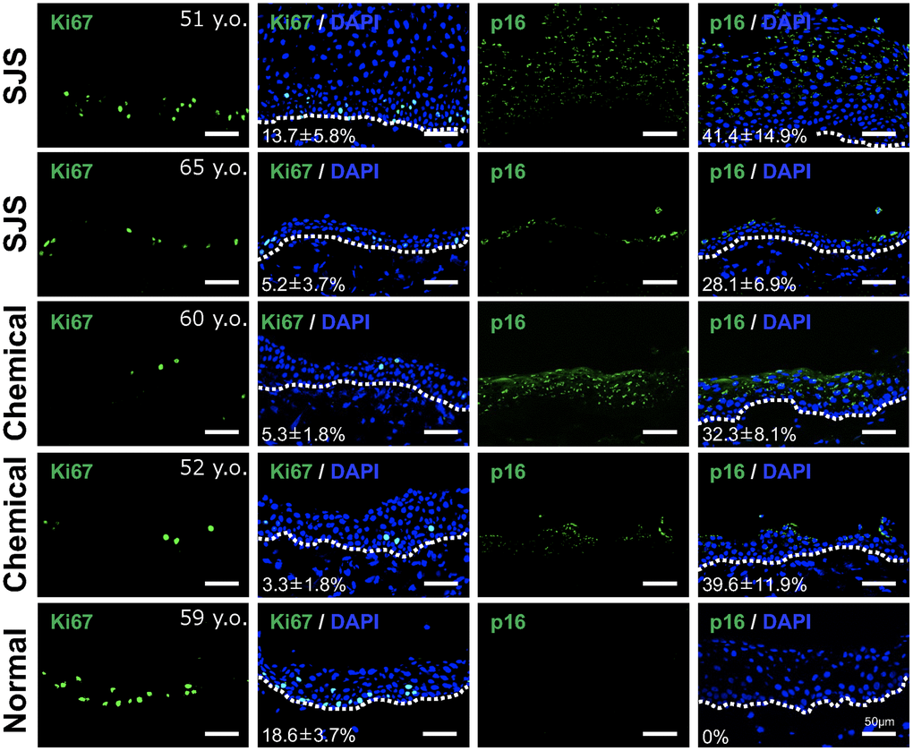One of the most intriguing findings of our study was the distinct gene expression profile observed in SCj compared to SCo, despite the significant similarity between nSCo and nSCj. SCj display more pronounced abnormalities in cellular differentiation. In a previous report, we showed that p16 expression was almost completely absent in individuals in their 50 s, but emerged after the age of 70 [12]. However, upon examination of pathological conjunctival tissues, we detected a significant number of p16-positive cells, even in patients in their 50 s or 60 s. Additionally, alteration in keratin expression patterns was observed, suggesting the involvement of senescent cells in the differentiation abnormalities of pathological tissues. These findings may indicate that ocular surface cells exposed to acute destructive inflammation in patients with LSCD, caused by Stevens-Johnson syndrome or chemical burns, are subject to high levels of stress, thereby accelerating the aging process of the ocular surface.
