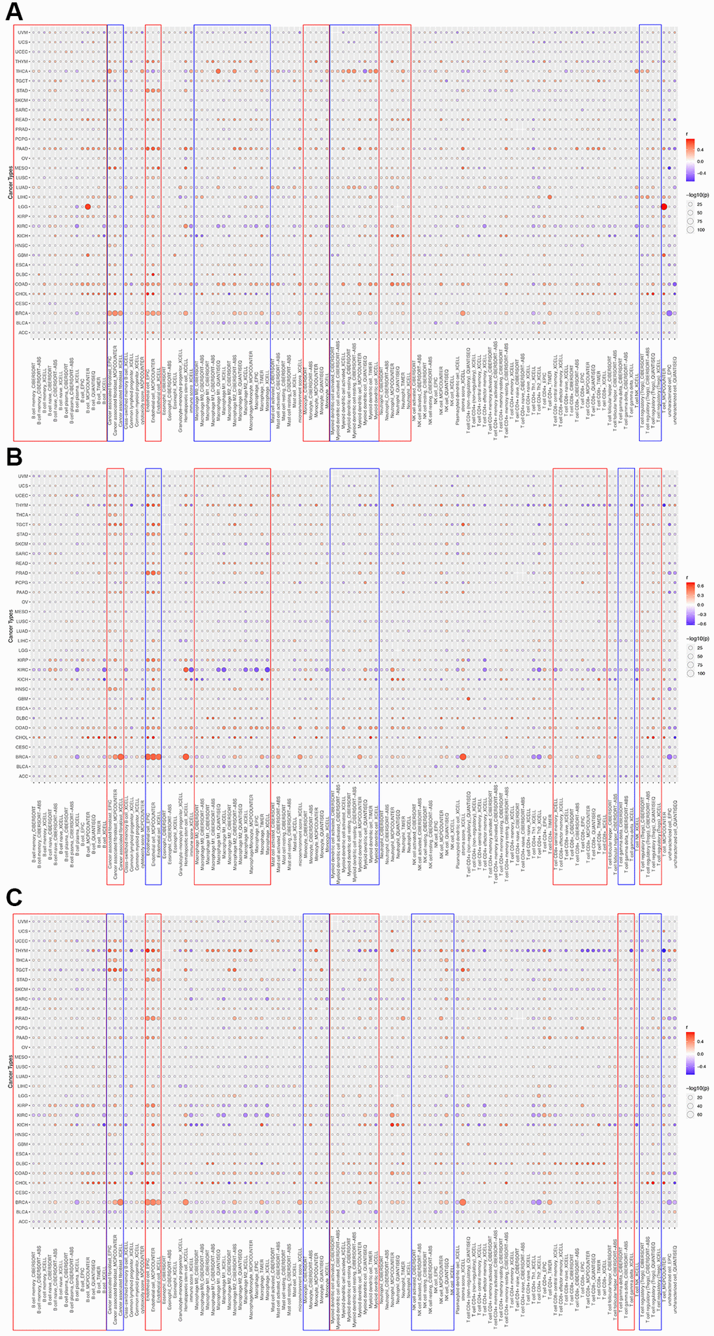 To determine the correlation between HOXD1, HOXD3, and HOXD4 and cancer immunity, the TIMER database was used. The outcomes showed that HOXD1 was positively connected with the infiltration levels of B cells, CAF, Endo, macrophages, monocytes, neutrophils, dendritic cells, and Tregs in most of the cancers (Figure 10A). Whereas, HOXD1 was negatively associated with the infiltration level of most immune cells such as the B cells, CAF, Endo, macrophages, Mast, neutrophils, monocyte, NK, CD8+ T, Tfh, and dendritic cells in UVM. In addition, HOXD3 was positively associated with the CAF, Endo, macrophages, dendritic, CD8+ T, and Tregs cells in most of the cancers and negatively correlated with the γ/δT cells in most cancers, especially in KIRC (Figure 10B). HOXD4 was positively associated with the B cells, CAF, Endo, monocytes, dendritic, NK, and Tregs cells in most of the cancers and negatively associated with the γ/δT cells in most cancers except UVM, THCA, GBM, ESCA, DLBC cancers (Figure 10C).