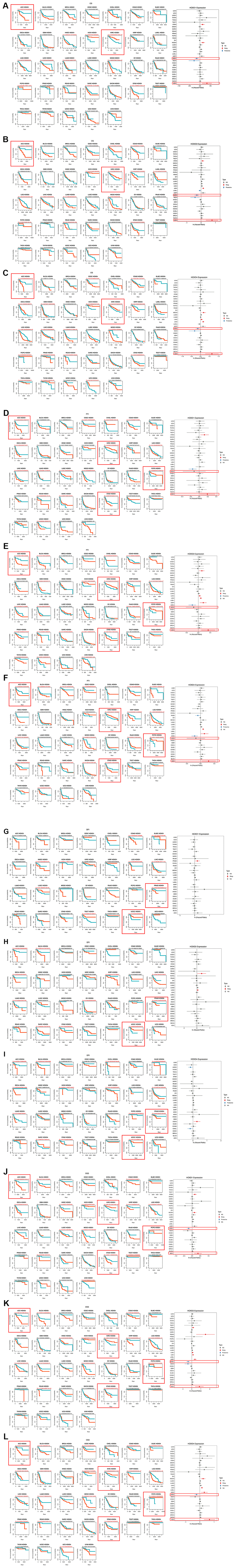 The effect of HOXD1, HOXD3, and HOXD4 expression on prognosis data including overall survival (OS), disease-specific survival (DSS), disease-free interval (DFI), and progression-free interval (PFI) in 33 types of cancers was calculated using the data from TCGA. The Cox regression and Kaplan-Meier (KM) plots were conducted to explore the influence of HOXD1, HOXD3, and HOXD4 on each prognosis type in pan-cancer.