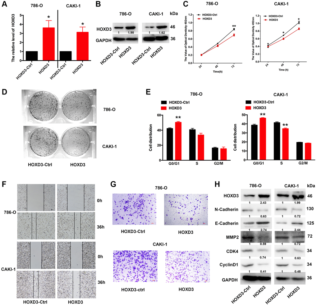 To further investigate whether overexpression of HOXD3 in ccRCC cells affects tumor proliferation in vitro, HOXD3 plasmid was used to overexpress HOXD3 in ccRCC cells. At first, the overexpression efficiency was validated using qRT-PCR and western blotting (Figure 5A, 5B). Subsequently, the proliferation of ccRCC cells was identified via MTT, clone formation, and cell cycle assays. As a result, MTT showed that the proliferation of ccRCC cells was remarkably suppressed after HOXD3 overexpressing (Figure 5C). What’s more, the colony numbers were markedly decreased in HOXD3 transfected cells compared with control transfected cells (Figure 5D). Furthermore, cell cycle analysis illustrated that HOXD3 overexpression arrested G1-S transition, which further validated that HOXD3 suppressed the proliferation of ccRCC cells (Figure 5E). In addition, wound healing and transwell invasion assays illustrated that HOXD3 could suppress the migration and invasion of ccRCC cells (Figure 5F, 5G). The expression of N-Cadherin, MMP2, CDK4, and cyclinD1 was decreased at the protein level and E-Cadherin was increased (Figure 5H) when HOXD3 was transfected in ccRCC cells. Collectively, these findings showed that HOXD3 promoted the inhibitor role of ccRCC cells.