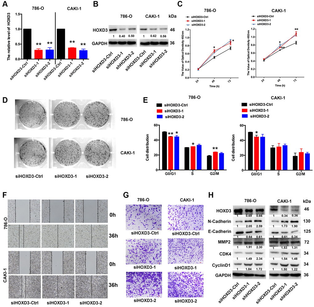 To investigate the role of HOXD3 in cell proliferation, metastasis, and invasion of ccRCC cells, silenced HOXD3 expression in 786-O and CAKI-1 cells using siRNA, and the HOXD3 expression was tested by qRT-PCR and western blotting (Figure 6A, 6B). The MTT assay revealed that downregulated HOXD3 increased the growth of ccRCC cells (Figure 6C). The colony numbers were markedly enhanced in siHOXD3 transfected cells compared with negative control cells (Figure 6D). Furthermore, cell cycle analysis illustrated that HOXD3 silencing induced the ccRCC cells at the G0 stage, (Figure 6E). What’s more, the suppression of HOXD3 enhanced the migratory and invasive capacities of 786-O and CAKI-1 cells (Figure 6F, 6G). Furthermore, the expression of N-Cadherin, MMP2, CDK4, and cyclinD1 was significantly elevated, and E-cadherin was inhibited in ccRCC cells that knocked down HOXD3 (Figure 6H), suggesting a tumor-suppressive role for HOXD3 in KIRC tumor.