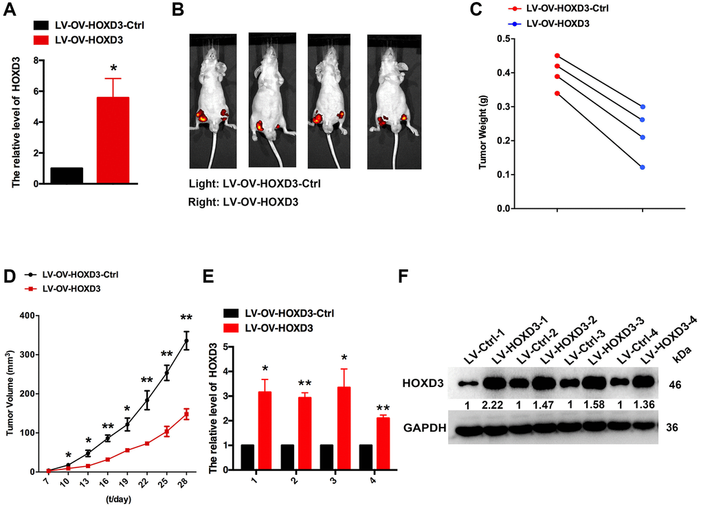 To demonstrate the function of HOXD3 in cell progression, the xenograft assay was performed. HOXD3 was highly expressed in CAKI-1 cells which were transfected with LV-OV-HOXD3 (Figure 7A). 1 × 106 of LV- OV-HOXD3-Ctrl and LV-HOXD3- transfected CAKI-1 cells were inoculated to the nude mice. Tumors grown from HOXD3 stable overexpression cells were slower than tumors grown from the LV-HOXD3-Ctrl cells (Figure 7B). Overexpression of HOXD3 significantly reduced tumor volume tumor weight and size compared with LV-NC (Figure 7C, 7D). Expression of HOXD3 in tumor tissues was assessed by qRT-PCR and western blotting. The results demonstrated that the HOXD3 expression significantly was higher in LV-OV-HOXD3- infected tumors than in LV-Ctrl (Figure 7E, 7F). These results demonstrated that overexpression of HOXD3 efficiently suppressed the tumorigenesis of KRIC in vivo.