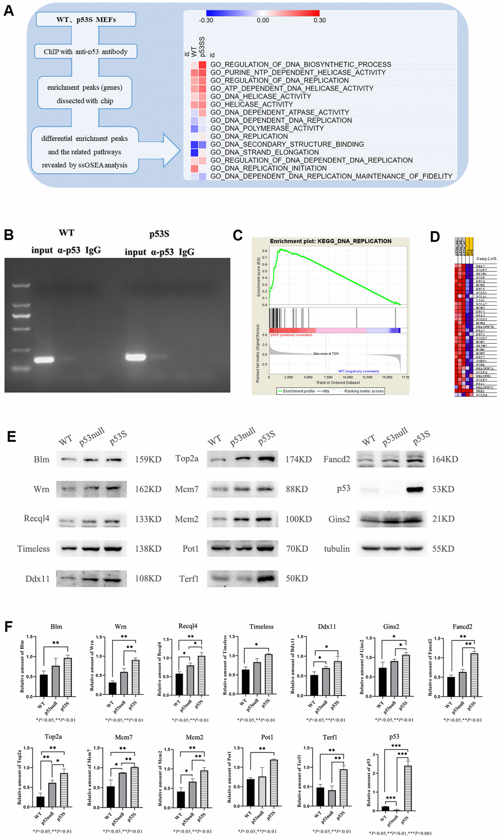 By using the mouse embryo fibroblasts (MEFs) generated from the homozygous p53S/S mice (p53S), with the control of wild type (WT) MEFs, we utilized anti-p53 antibody to perform ChIP-chip assay [21]. When we analyzed the data by single sample gene set enrichment analysis (ssGSEA), we found that p53S could transcriptionally up-regulate the DNA replication process, probably through up-regulating the activity of DNA helicases (Figure 1A), the genes involved in this regulation included Mcm2, Gins2 etc. (supplementary Figure 1). Further ChIP assay combined with semi-quantitative PCR revealed that both wild type p53 and p53S could bind to Mcm2 gene promoters, while the p53S showed higher affinity than wild type p53 (Figure 1B). To understand the expressional consequence of this regulation, we further analyzed the RNA-seq data by gene set enrichment analysis (GSEA). We found that compare to the wild type MEFs, the p53S MEFs expressed higher level of DNA replication related genes (Figure 1C), including DNA polymerases (PolD, PolE, PolA, etc.), DNA helicases (Mcm5, Mcm3, Mcm4, Mcm2, Mcm6, Mcm7, etc.), replication factors (RFC 4, RFC 5, RFC 3, RFC 1, etc.), single-stranded DNA binding proteins (RPA3, RPA2, RPA1, SSBP1, etc.) (Figure 1D). Together these data suggest that p53S transcriptionally up-regulates the expression of DNA replication related genes, especially DNA helicases.