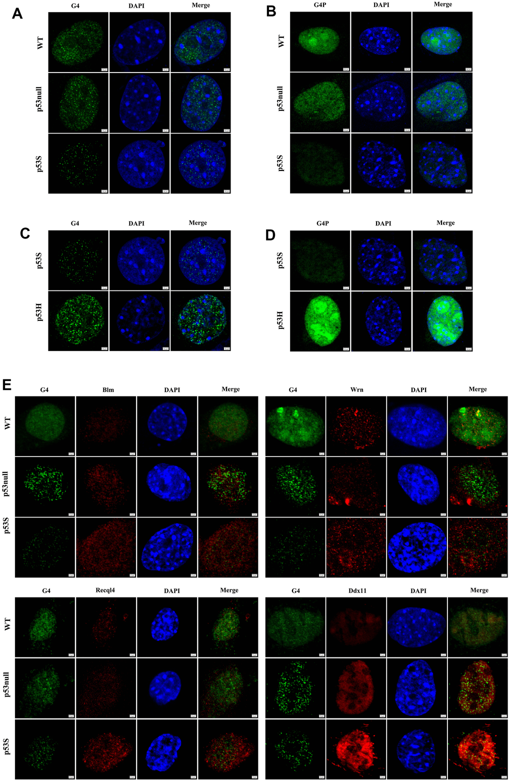 Given the idea that the unwinding of G4 structure might due to the elevated helicase level, we then performed double immunofluorescence staining to investigate the colocalization of G4 structure and DNA helicase protein. The data revealed that in the nuclei of all three cells, helicase Blm, Wrn, Recql4, and Ddx11 colocalized with G4 structures more or less (Figure 2E). While in p53S cells, consistent with the Western blot results, we again observed higher level of Blm, Wrn, Recql4, and Ddx11 proteins than in p53null and WT cells, which colocalized and might attribute to the much less G4 structures in p53S cells (Figure 2E, p53S). Interestingly, in p53null cells, even with higher level of DNA helicase than in WT cells, the level of detectable G4 structures were also higher than in WT cells (Figure 2E, p53null and WT). These data indicated that p53S up-regulated the expression of DNA helicase and promoted the G4 unwinding by these helicases, which was not observed in p53null cells, suggesting this function as the gain of function of p53S mutant protein.
