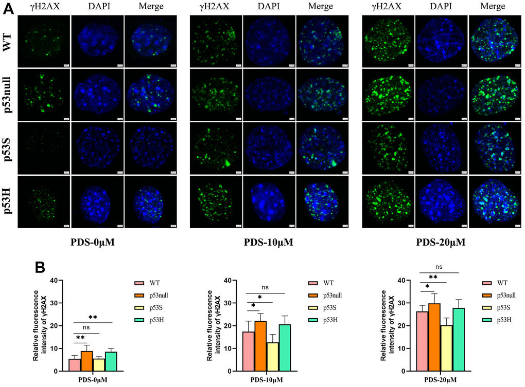 To further verify these data, we applied the G4 structure stabilizer pyridostatin (PDS) [27] to the WT, p53null, p53S, and p53H cells, and compared the cellular responses. By DNA damage marker γ-H2AX staining, we found that the p53S cells showed the least γ-H2AX signals upon the treatment of 10 μM and 20 μM PDS, while surprisingly, p53null and p53H cells showed much more abundant γ-H2AX signals than WT and p53S cells (Figure 3A). The amount of γ-H2AX signal was quantified in Figure 3B.