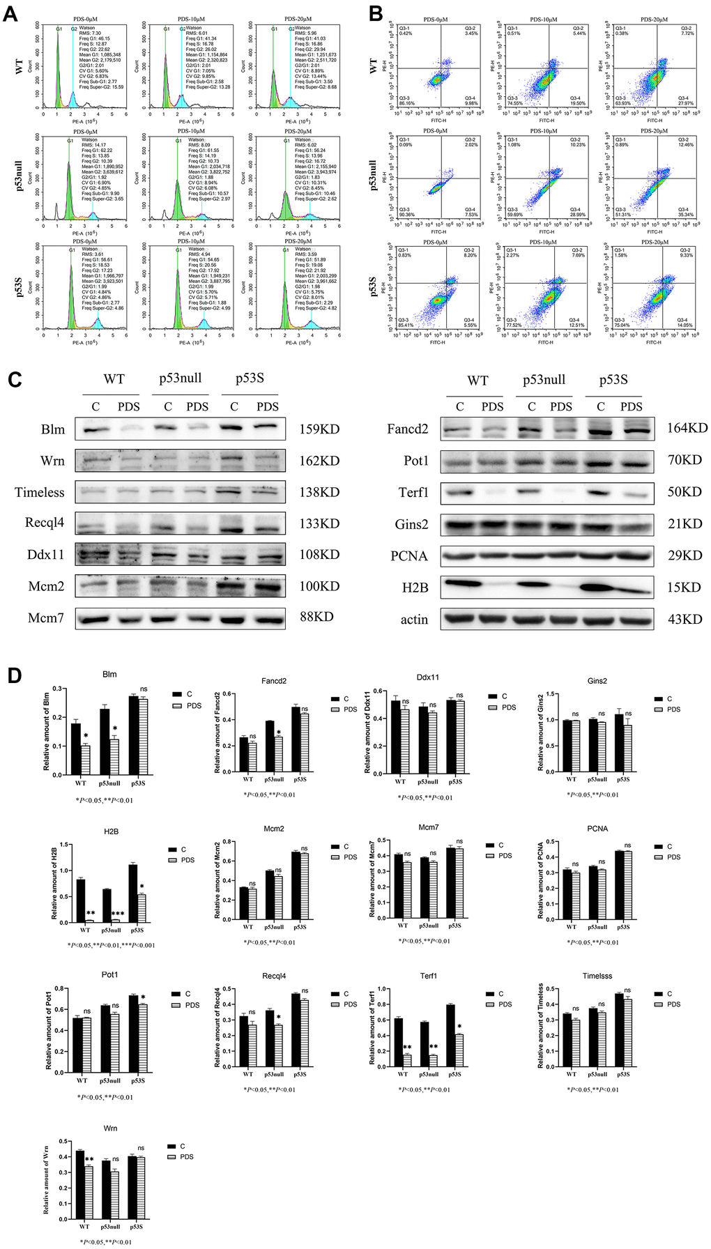 The cell cycle results revealed that upon the PDS treatment, the WT cells showed a slight increase of G2 phase in a dose-dependent manner, and a slight increase of sub-G1 phase when the PDS concentration was 20 μM (Figure 4A, WT), the p53null cells showed an obvious increase of G2 phase when treated with 20 μM PDS (Figure 4A, p53null), while the p53S cells showed only a slight increase of G2 phase even when the PDS concentration was 20 μM (Figure 4A, p53S).