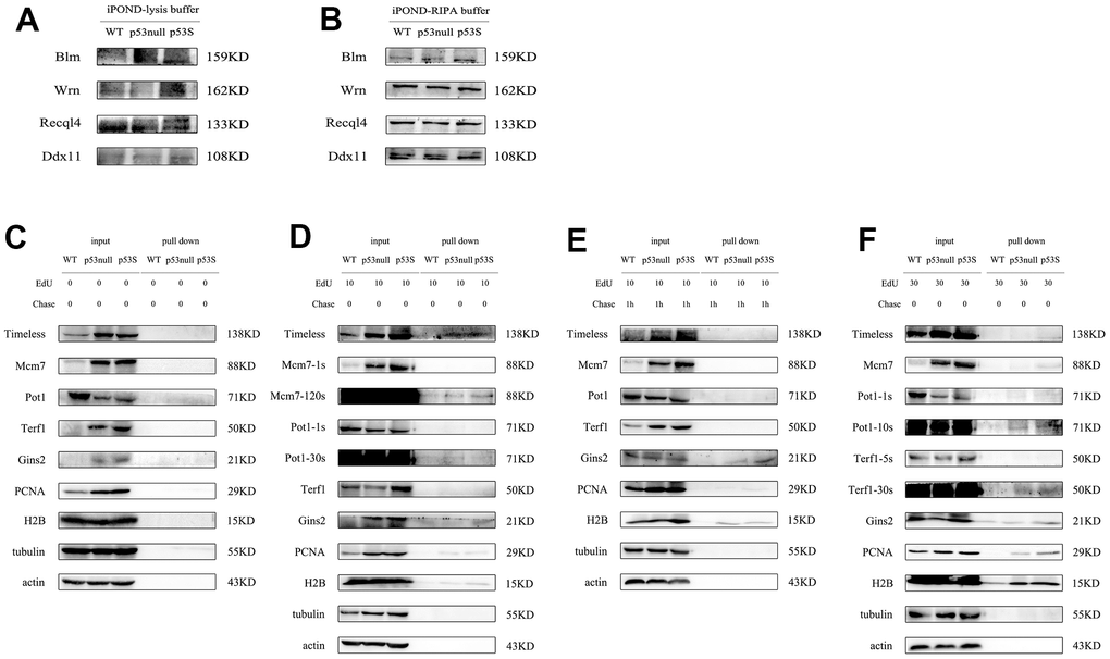 With the iPOND assay, we analyzed the proteins bound to DNA replication forks. As the blank control, without EdU incorporation, we did not detect any non-specific binding (Figure 5C). By EdU incorporation for 10 min, we could already pull-down replication fork bound Timeless, as well as Mcm7, Gins2. And the p53S cell contained more replication fork bound Timeless, Mcm7, Gins2 proteins (Figure 5D). The telomere protein Pot1 was also detected in all three cells, without obvious difference (Figure 5D, Pot1). The positive control proteins PCNA and H2B could also been pulled down by 10 min EdU incorporation (Figure 5D, PCNA, H2B). We then did the 10 min EdU incorporation and followed by thymidine chase, to push the EdU labeled DNA away from the newly formed replication forks. After the thymidine chase, we could not detect Timeless, Mcm7, which confirmed that the Timeless, Mcm7 only bound to the replication forks and functioned there (Figure 5E). While we still could detect Gins2 and Pot1, suggested that they continuously bound to DNA strands (Figure 5E). We further did 30 min EdU incorporation, again we detected clearly the replication fork bound Timeless, Mcm7, Gins2, and Pot1, and they were more abundant in p53S cells (Figure 5F). Other than these, we could also detect small amount of Terf1 proteins bound to the replication forks, might reflect the replication forks in telomere DNA (Figure 5F, Terf1). However, we did not detect the specific G4 structure unwinding helicases, such as Wrn, Blm, Recql4 etc. located on the replication forks, even by EdU incorporation for 30 min, which suggested these helicases were not directly bound to the DNA replication forks with newly synthesized DNA.
