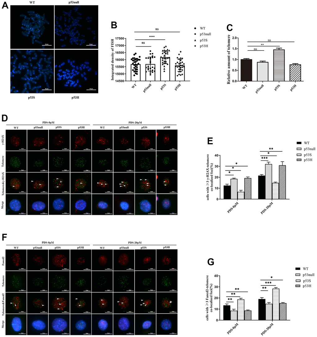 We further evaluated the recruitment of Fancd2 at telomeres before and after PDS treatment. Without PDS treatment, we already observed more telomere located Fancd2 in p53S cells (Figure 6F, 6G, PDS-0 μM). After PDS treatment, we observed an increase of the amount of telomere located Fancd2 in all four cells, while the p53S still recruited more Fancd2 to the telomere DNA than p53null, p53H, or WT cells (Figure 6F, 6G, PDS-20 μM).