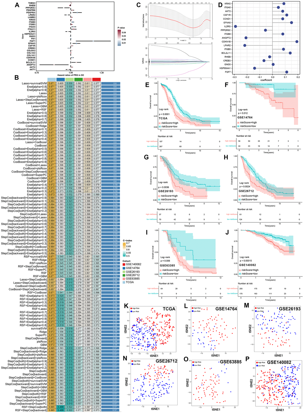 Above 29 potential prognostic biomarkers were then subjected to an integrative procedure including 10 machine learning-based methods, with which we could develop an accurate and stable prognostic PRS. Aa result, a total of 101 kinds of prediction models were obtained, and their C-index of training cohort (TCGA) and testing cohort (GSE14764, GSE26193, GSE26712, GSE63885 and GSE140082) were shown in Figure 1B. We could see that the model constructed by Lasso + survivalSVM method was considered as the optimal model and they had a highest average C-index of 0.6 (Figure 1B). In the Lasso regression, the optimal λ was obtained when the partial likelihood deviance reached the minimum value based on the LOOCV framework (Figure 1C). A total of 19 genes with nonzero Lasso coefficients were submitted to survivalSVM, which identified a final set of 19 PRS and their coefficients were shown in Figure 1D. Using the cut-off value, we then divided into ovarian cancer cases into high and low risk groups based on their risk scores (PRS score). As expected, ovarian cancer patients with high risk score had a poor OS rate in TCGA (p<0.0001, Figure 1E), GSE14764 (p=0.012, Figure 1F), GSE26193 (p=0.0036, Figure 1G), GSE26712 (p=0.0024, Figure 1H), GSE63885 (p=0.006, Figure 1I) and GSE140082 (p=0.00015, Figure 1J) cohort. tSNE analysis about the classification of ovarian cancer cases into high- and low-risk groups of training cohort and testing cohort were shown in Figure 1K–1P. On the basis of above findings, we concluded that this PRS was capable of predicting the prognosis of ovarian cancer patients.