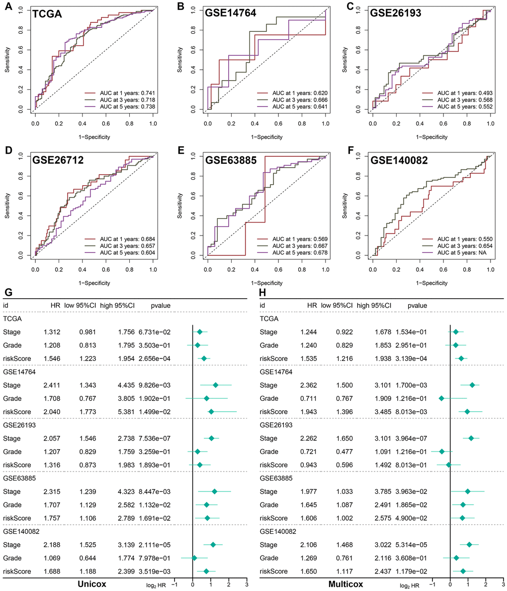 ROC analysis was performed to evaluate the discrimination of PRS in training cohort and testing cohort, with 1-, 3-, and 5-year AUCs of 0.741, 0.718, and 0.738 in TCGA cohort (Figure 2A); 0.620, 0.666, and 0.641 in GSE14764 cohort (Figure 2B); 0.493, 0.568, and 0.552 in GSE26193 cohort (Figure 2C); 0.684, 0.657, and 0.604 in GSE26712 cohort (Figure 2D); 0.569, 0.667, and 0.678 in GSE63885 cohort (Figure 2E), respectively. In GSE140082 cohort, 1-, and 3-year AUCs were 0.550 and 0.640, respectively (Figure 2F). Further univariate and multivariate cox regression analysis demonstrated risk score as an independent risk factor for the prognosis of ovarian cancer patients in TCGA, GSE14764, GSE26193, GSE63885 and GSE140082 cohort (Figure 2G, 2H). We then compared the C-index of our PRS and 54 prognostic signatures that have been established for ovarian cancer. As shown in Supplementary Figure 3A, the C-index of the current PRS was higher than most of 54 random prognostic signatures. All in all, our PRS had a relatively good performance in predicting the clinical outcome of ovarian cancer patients. Considering PRS-based risk score, clinical stage and tumor grade, we then developed a nomogram for predicting the overall survival of ovarian cancer patients (Supplementary Figure 3B), which could help the clinicians evaluate the clinical outcome of ovarian cancer patients and make an appropriate follow-up project. Compared with the idea curve, nomogram-based calibration curves had a relative well predictive value in predicting the 1-, 3-, and 5-year OS rate (Supplementary Figure 3C).