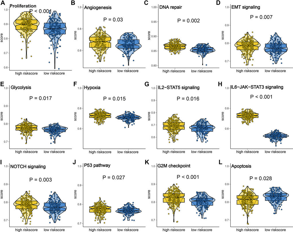Immune cell recruitment to the tumor microenvironment is a promising therapeutic strategy, even in aggressive tumors. Increasing evidences have highlighted the vital role of the PI3K/ATK pathway in clinical management of cancer [34, 35]. Conventional chemotherapeutics exert tumor-suppressive effects mainly by inducing the release of DMAPs from cancer cells, activating the presentation of DC cells, thus activating CD8+ T cells to kill cancer cells. The efficacy of these immunotherapy agents and their correlation with the PI3K/ATK pathway [36, 37]. In order to further clarify the role of PRS in TME, we applied several algorithms to explore the underlying association of PRS with immune infiltration. As a result, some immune cells, including T cells, B cells, myeloid dendritic cells, and neutrophils, were more active in PRS-based low risk score group. Moreover, some cancer-related hallmarks were more active in PRS-based high risk score group, including proliferation, angiogenesis, DNA repair, EMT signaling, Glycolysis, Hypoxia, NOTCH signaling, and P53 pathway. These evidences identified that PRS might be involved in the development of ovarian cancer by regulating tumor immunity.