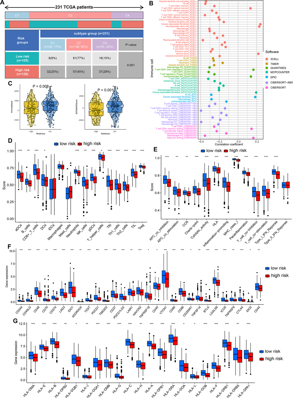 Tumor immune landscape could be clustered into six different types, including wound healing (C1), IFN-g dominant (C2), inflammatory (C3), lymphocyte depleted (C4), immunologically quiet (C5) and TGF-b dominant (C6) [21]. As shown in Figure 4A, C2 ranked most of TCGA ovarian cancer cases in both low and high risk group. However, the proportion of C4 in high risk group was significantly higher than that in low risk group (Figure 4A, p=0.001). With several algorithms including CIBERSORT, MCPcounter, QUANTISEQ, XCELL, CIBERSORT-ABS, TIMER and EPIC, we provided insights into the immune landscape in low and high risk groups to avoid inaccuracy and bias caused by the use of a single algorithm. Significant negative correlation was obtained between risk score and the abundance of most immune cells (Figure 4B). As expected, negative correlation was obtained between risk score and the abundance of most immune cells (Figure 4C, all p<0.05). As expected, low risk score indicated a higher ESTIMATE score and Immune score in ovarian cancer (Figure 4C, all p<0.05). In CIBERSORT algorithm, ovarian cancer with low risk score had a higher level of aDcs, B cells, CD8+ T cells, DCs, neutrophils, NK cells, pDCs, T helper cells, Tfh, Th1 cells, Th2 cells, TIL and Treg (Figure 4D). Moreover, low risk score was associated with a higher score of immune related functions in ovarian cancer, including APC_co_inhibition and stimulation, cytolytic activity, MHC cluss I, parainflammation, T cell co_inhibition, and type_I_IFN_reponse (Figure 4E, all p<0.05). Low risk score indicated a higher level of most of HLA-related genes (Figure 4F, p<0.05) and immune checkpoints (Figure 4G, p<0.05) in ovarian cancer patients. These results suggested that low risk score may be a relatively “hot” tumor phenotype compared with high risk score in ovarian cancer.