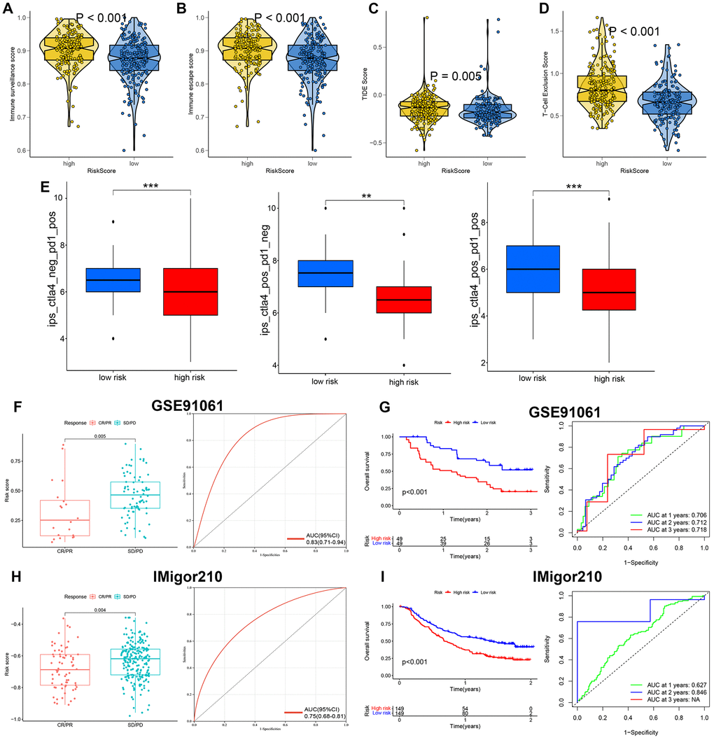 The above clarified the significant correlation between risk score and TME and the results suggested that ovarian cancer with low risk score may be a relatively “hot” tumor phenotype. Thus, we then explored whether risk score could predict the response to immunotherapy in ovarian cancer. As shown in Figure 5A, 5B, ovarian cancer with high risk score had a higher score of immune escape (Figure 5A, p<0.001) and immune surveillance (Figure 5B, p<0.001). Higher TIDE score and low IPS scores indicate higher immune escape potential and lower immunotherapy response rates. In our study, high risk score indicated a higher TIDE score (Figure 5C, p=0.005) and T cell exclusion score (Figure 5D, p<0.001) in ovarian cancer. IPS was a superior predictor of response to anti-CTLA-4 and anti-PD-1antibodies and high IPS indicated a better response to immunotherapy [22]. The results suggested that ovarian cancer with low risk score had a higher CTLA4 IPS, PD1 IPS and CTLA4/PD1 IPS (Figure 5E, all p<0.05). These results suggested that ovarian cancer patients with low risk score may be more sensitive to immunotherapy. In order to verify these results, we then used two immunotherapy cohorts, including IMvigor210 cohort and GSE91061 cohort. As shown in Figure 5F, patients in CR/PR group had a significant lower risk score, with an AUC of 0.83 in ROC curve (p=0.005). Interestingly, high risk score was associated with a poor OS rate, with 1-, 2-, and 3-year AUCs of 0.706, 0.712, and 0.718 (Figure 5G). Similar results were obtained in IMvigor210 dataset, which showed that CR/PR group indicated a lower risk score, with an AUC of 0.75 in ROC curve (Figure 5H, p=0.004). And patients with high risk score had a poor OS rate, with 1-, and 2- year AUCs of 0.627, 0.846 (Figure 5I, p<0.001). These evidences may suggest that ovarian cancer patients with low risk score may be more sensitive to immunotherapy and PRS may be an indicator for immunotherapy response. We then estimated the IC50 value of drugs correlated with chemotherapy and endocrinotherapy between high and low risk score group in order to guide clinical treatment in ovarian cancer. The result suggested that low risk score group tended to benefit from chemotherapy with 5-Fluorouracil, Cisplatin, Cyclophosphamide, Docetaxel, Epirubicin, Gemcitabine, Olaparib, Oxaliplatin, Topotecan, Tamoxifen, Erlotinib and Foretinib (Supplementary Figure 6A–6L, all p<0.05).