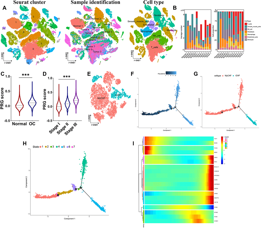 A total of 5 normal tissues and 7 ovarian cancer tissues were analyzed to characterize the immune landscape in ovarian cancer. As shown in Figure 6A, all the cells in these tissues could be clustered into 7 subtypes, including T cells, Smooth muscle cells, NK cell, Fibroblasts, Macrophage, NK cell, and Endothelial cells and Monocyte. We then explored the fraction of different immune cell types in each sample, revealing that different immune cell types varied significantly among different samples (Figure 6B). To be specific, T cells were prevalent in tumor tissues while smooth muscle cells were predominant in normal tissues (Figure 6B). Compared with normal tissues, ovarian tissues had a high PRG score (Figure 6C). With the progression of ovarian cancer, the PRG score was increasing (Figure 6D). These results further revealed that the activation of PI3K/ATK signaling participated in the tumor progression and shortened prognosis in ovarian cancer patients. As cancer-associated Fibroblast (CAF) plays a vital role in tumor progression. We then collected Fibroblast in tumor for further analysis. Using t-SNE analysis, CAF were categorized as myCAF and iCAF cells (Figure 6E). Further analysis revealed a different trajectory between different pseudotime, state, and cell subtypes in the development trajectory analyses of CAF cells (Figure 6F–6H). Figure 6I revealed the expression of PRG in different state of CAF cells.