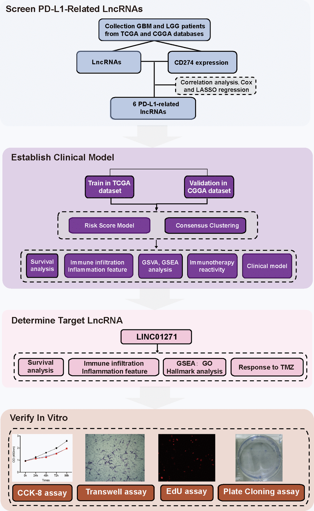 Herein, for the first time, we established a risk score model containing 6 PD-L1-related lncRNAs to reflect individual heterogeneity of gliomas and provide a tool for prognostic stratification. LINC01271 was chosen as the target lncRNA to validate its predictive efficacy on the clinical and pathological features, and prognosis of glioma (Figure 1 Flow Chart).