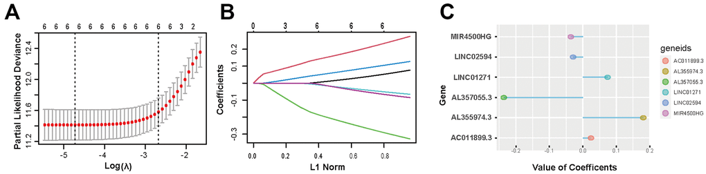 According to the expression of 6 PD-L1-related lncRNAs in samples, the risk score model was established with the formula: