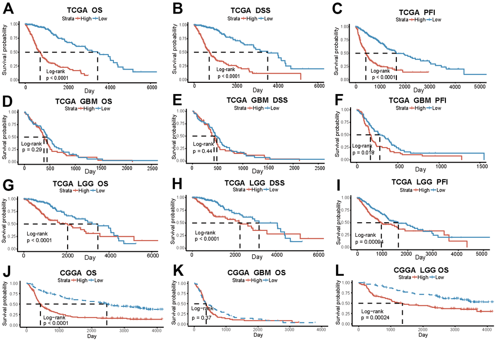 The prognostic outcome of glioma is intricately linked to the risk score. The survival analysis of the TCGA data revealed that, among all glioma patients, the low-risk score group exhibited significantly superior prognosis compared to the high-risk score group (p<0.0001) (Figure 3A–3C). However, in terms of tumor pathological classification, only the PFI shows a significant difference among GBM patients with varying risk scores (p=0.018). In contrast, the three prognostic indicators of LGG patients are all significant differences (OS, DSS: p<0.0001, PFI: p=0.00094) (Figure 3D–3I). The survival analysis in the CGGA validation dataset, which contains 306 patients, yields similar results. Significantly different OS between two risk groups exists among both all glioma and separate LGG patients (OSALL: P <0.0001; OS LGG: P = 0.00024), but not in GBM subgroup (p=0.37) (Figure 3J–3L).