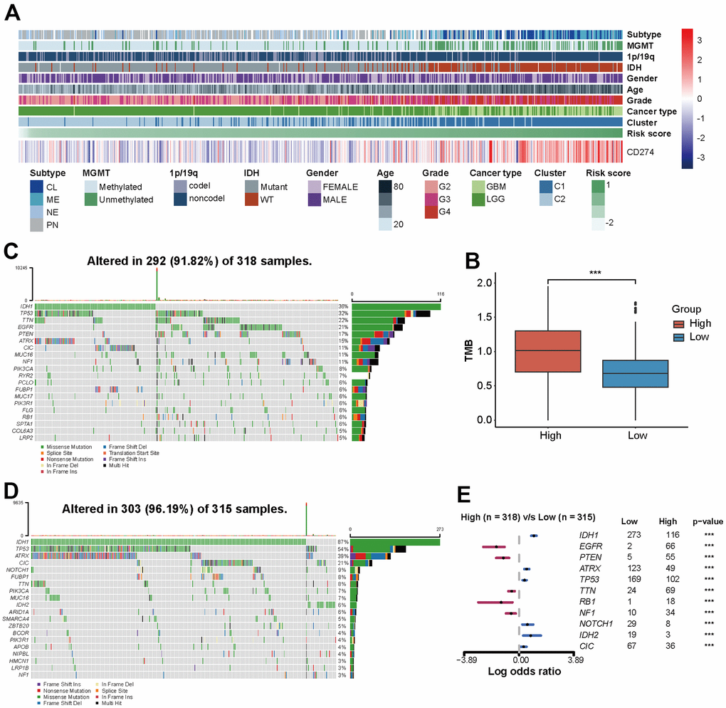 Glioma is of great concern because of its high fatality rate. According to the degree of malignancies, lower-grade gliomas (LGG) are classified as World Health Organization (WHO) II and III, including diffuse low-grade and intermediate-grade gliomas. In contrast, glioblastomas (GBM) belong to WHO grade IV [1], with the highest incidence and lowest survival [2]. Surgical resection is mainly applied to treat glioma, combined with radiotherapy, chemotherapy, and other comprehensive methods [3]. Nevertheless, the therapies are inefficacious due to the infiltration and invasion of glioma. The median overall survival (OS) of GBM patients is only 12-18 months after diagnosis, even under the optimal treatment [4]. For decades, researchers have actively explored glioma's pathological features to discover biomarkers for early diagnosis, providing targets for gene therapy and immunotherapy [3–6], aiming to provide better health care and personalized medicine for glioma patients.