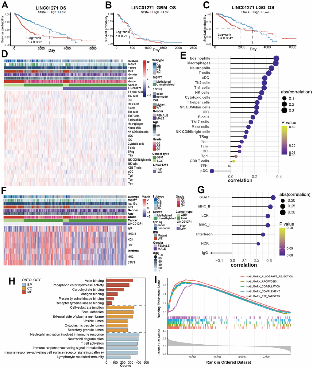 GSEA analysis revealed that LINC01271 mainly participated in the same biological process as the 6 PD-L1-related lncRNAs model, but concentrated on different cellular components, including the cell-substrate junction, focal adhesion, external side of the plasma membrane and others, and were related to molecular functions like acting binding and phosphoric ester hydrolase activity (Figure 7H). The expression of LINC01271 is also in connection with some hallmark gene sets, such as APOPTOSIS, COAGULATION, COMPLEMENT, and E2F TARGETS (Figure 7I), suggesting the immune pathways related to characteristic genes, and perhaps related to the mechanism of LINC01271’s biological role in glioma.