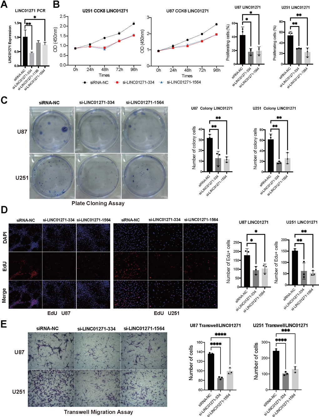 We silence LINC01271 gene expression in U251 and U87 to detect proliferation and migration. RT-qPCR confirmed the silencing efficiency of siRNA, si-LINC01271-334 and si-LINC01271-1564 significantly reduced the expression of LINC01271, si-LINC01271-1196 also had the same trend (Figure 8A). CCK-8 assay, plate cloning assay, and Edu assay showed that tumor cell proliferation and colony formation were inhibited after silencing LINC01271 (Figure 8B–8D). Transwell migration assay suggested inhibition of tumor cell migration after LINC01271 knockout (Figure 8E). In conclusion, knockout of LINC01271 visibly suppressed the proliferation and migration of glioma cells, proving that LINC01271 positively regulates the progression of glioma and lncRNA LINC01271 is expected to become a new target for the treatment.