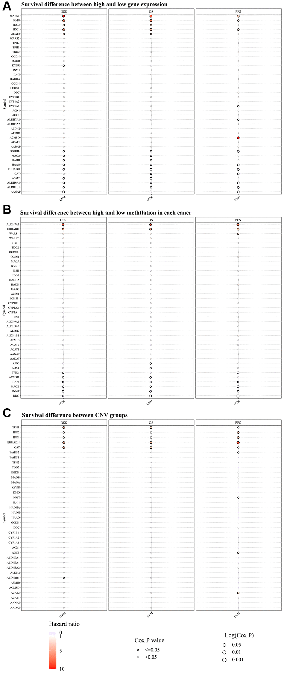 In assessing the survival differences linked to TMRGs alterations in UVM patients, a thorough analysis of the mRNA expression of TMRGs in the UVM cohort from TCGA revealed a significant correlation. High expression levels of WARS1, KMO, and IDO1 were associated with shorter DSS, OS, and PFS. Conversely, low expression of OGDHL, HAAO, EHHADH, ALDH9A1, ALDH1B1, and AANAT yielded similar outcomes (Figure 1A). Additionally, an examination of TMRGs methylation levels classified UVM patients into two groups: those with hazard ratios exceeding 1 and those below. It was found that higher methylation of ALDH7A1 and EHHADH, and lower methylation of IDO2, MAOB, INMT, and DDC were indicative of unfavorable DSS, OS, and PFS outcomes (Figure 1B). A subsequent survival analysis using CNV data in UVM confirmed that CNV of TPH1, IDO2, IDO1, EHHADH, and CAT were also associated with poor DSS, OS, and PFS (Figure 1C).