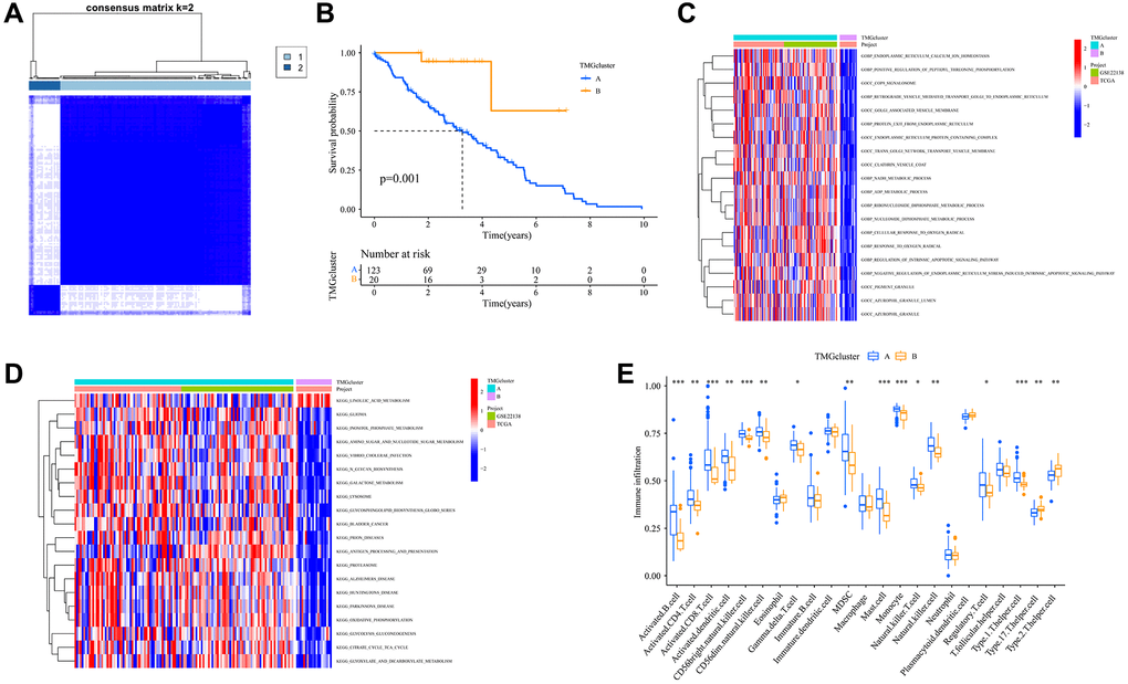 To elucidate the role of TMRGs in UVM progression, we analyzed various genomic factors. We classified patients from TCGA and GSE22138 into two distinct clusters based on the consensus matrix (Figure 2A). Notably, cluster A exhibited a significantly prolonged OS compared to cluster B (Figure 2B). A GSVA in GO revealed enrichment in metabolic processes (such as NADH, ADP, ribonucleoside diphosphate, and nucleoside diphosphate) as well as vesicle and granule pathways in cluster A (Figure 2C). Similarly, a GSVA in KEGG showed that cluster A was rich in diverse pathways, including cancer (glioma and bladder cancer) and metabolic pathways (like linoleic acid, glyoxylate and dicarboxylate, inositol phosphate, and galactose) (Figure 2D). Delving deeper with ssGSEA, we observed greater immune cell infiltration in cluster A, characterized by the prevalence of immune cell types such as Activated. B.cell, Activated (Figure 2E). CD4.T.cell, Activated.CD8.T.cell, and others. Our findings suggest that TMRGs may play a pivotal role in UVM progression, potentially by regulating immune-related and metabolic processes and pathways.