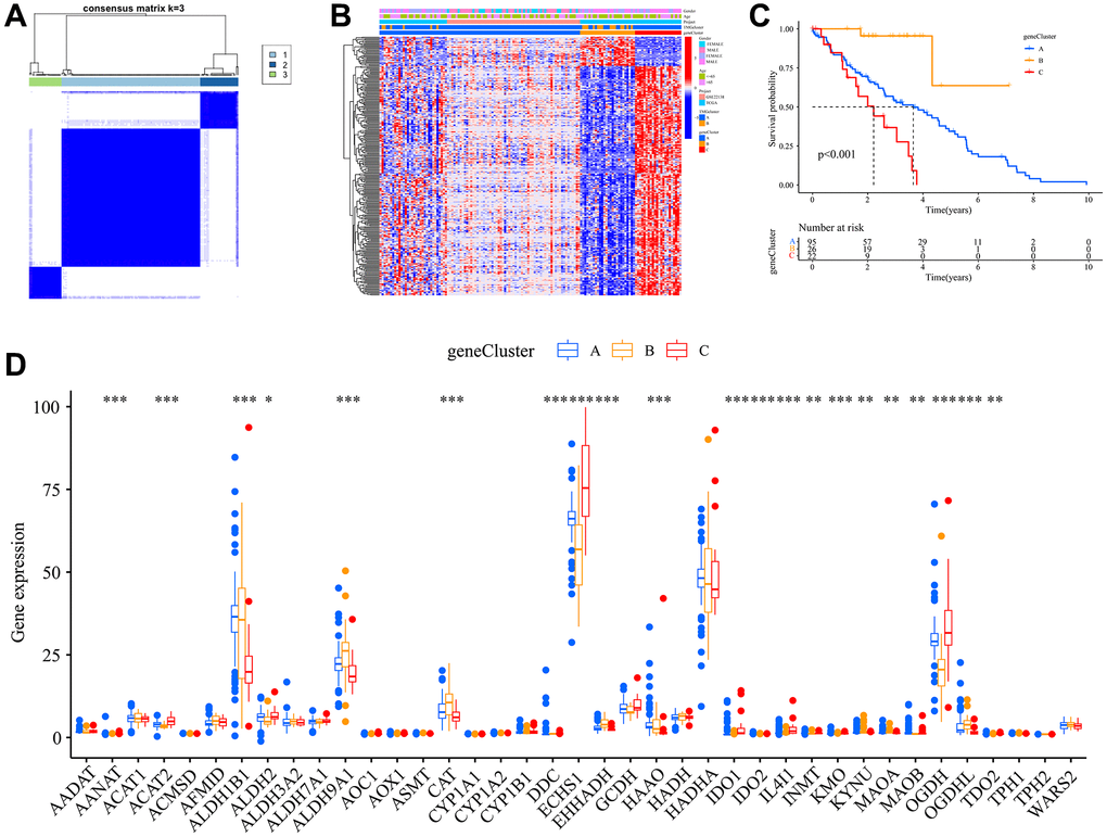 Among the subtypes, subtype A showed a more favorable survival outcome. GO and KEGG enrichment analyses, performed using GSVA, revealed that subtype A was mainly enriched in cancer and metabolic pathways. Furthermore, based on prognosis-related DEGs, three distinct gene subtypes were identified. Of these, subtype A presented a survival advantage over the others, underscoring the prognostic potential of our Trp-associated signature.
