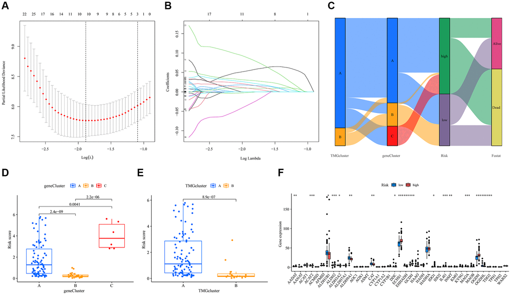 We subjected UVM patients to LASSO and multivariate Cox regression analyses, identifying five key model genes with their associated coefficients (Figure 4A, 4B). The resulting formula was: risk score = (−0.168 × expression of ATP13A3) + (0.060 × expression of CHST11) + (0.218 × expression of TPST2) + (0.085 × expression of TAPBPL) + (0.045 × expression of MRPL24). Using this risk score, we stratified the patient cohort into high-risk and low-risk groups based on the median signature risk score. A Sankey diagram illustrated the distribution and characteristics of patients, highlighting the majority in the high-risk group who sadly succumbed (Figure 4C). Notably, the risk score distribution varied among TMG and gene clusters: gene cluster C had the highest risk score, while TMRGs cluster A was associated with a higher risk score (Figure 4D, 4E). Moreover, significant differences in TMRGs expression levels, including AADAT, ACAT2, and ECHS1 among others, emerged between the high- risk and low-risk groups (Figure 4F).