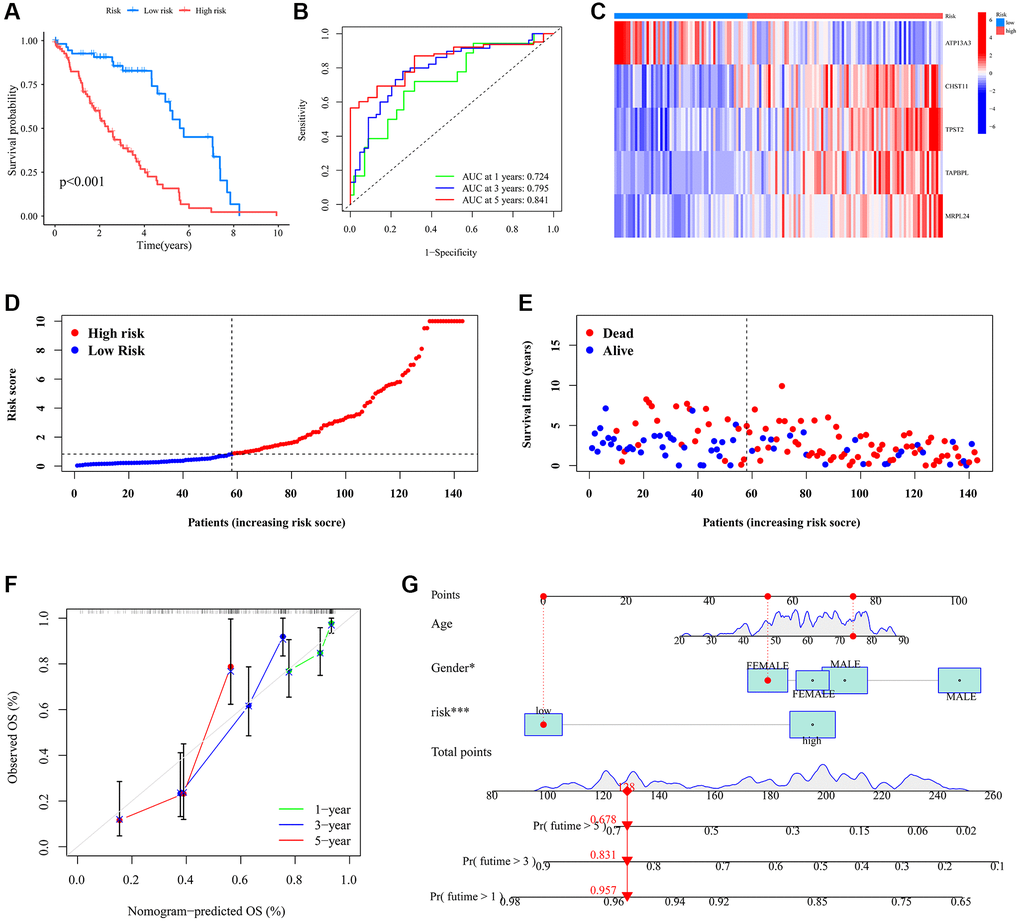 The Kaplan-Meier survival curve demonstrated that the low-risk patient group had a significantly longer OS than the high-risk group (Figure 5A). Time-dependent ROC curves for 1-year, 3-year, and 5-year OS yielded AUCs of 0.724, 0.795, and 0.841, respectively (Figure 5B). A heatmap visualized the expression patterns of the five model genes across different risk score groups (Figure 5C). As risk scores increased, the distribution of survival status showed a rising mortality rate (Figure 5D, 5E). The calibration plot highlighted a strong alignment between observed and predicted outcomes (Figure 5F). Cox analysis results identified both gender and risk score as independent prognostic factors for UVM patients (Figure 5G). Collectively, these results underscore the reliability of the risk score as a prognostic tool for UVM.