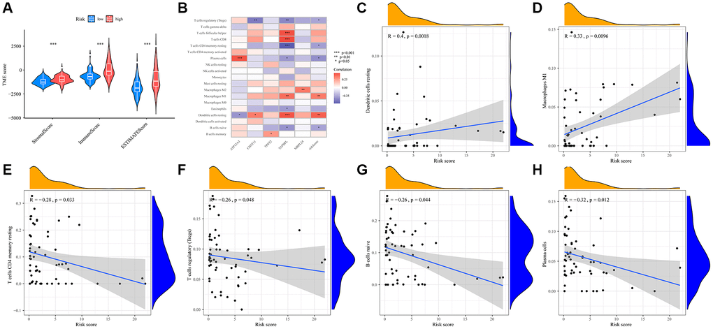 Upon a thorough examination of immune scores, we discerned that the high-risk group demonstrated a pronounced increase in their stromal, immune, and ESTIMATE scores (Figure 6A). To further elucidate differences in immune infiltration, we compared the low- and high-risk groups (Figure 6B). Notably, high- risk patients showed a significant presence of certain immune cells, notably resting dendritic cells (Figure 6C) and M1 macrophages (Figure 6D). Conversely, the low-risk group was characterized by a higher abundance of T cells CD4 memory resting (Figure 6E), regulatory T cells (Tregs) (Figure 6F), naive B cells (Figure 6G), and plasma cells (Figure 6H).