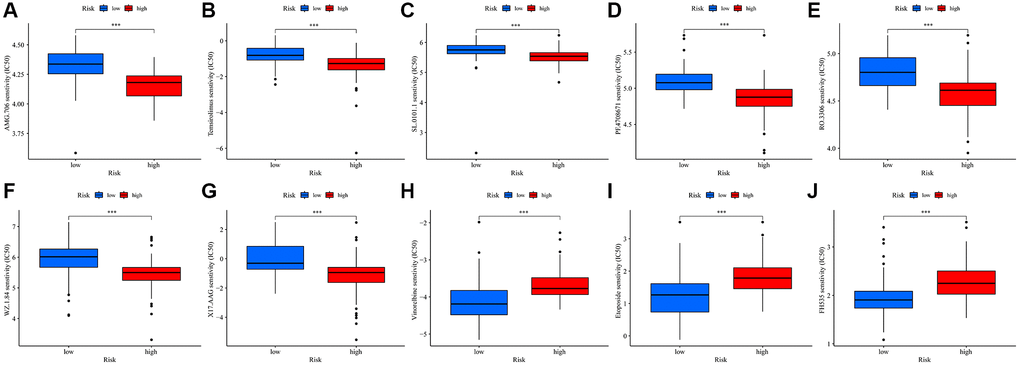 Our study also sought to assess the responsiveness of patients in different risk score groups to common immunotherapeutic drugs. Interestingly, the high-risk group predominantly showed lower IC50 values for several drugs, namely AMG.706, temsirolimus, SL.0101.1, PF.4708671, RO.3306, WZ.1.84, and X17.AAG (Figure 7A–7G). On the other hand, the low-risk group displayed lower IC50 values for vinorelbine, etoposide, and FH535 (Figure 7H–7J). From this comprehensive data analysis, we deduced that high-risk patients tend to have a heightened responsiveness to immunotherapy.