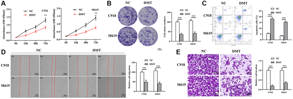 5 × 103 cells were seeded onto a 96-well plate and allowed to adhere overnight in a medium containing 10% FBS. After the initial treatment, cell viability was gauged using the Cell Counting Kit-8. Post-DMT treatment, the cells were left to form colonies for seven days. Following this period, the cells were fixed, stained, and colony numbers were quantified using ImageJ software.
