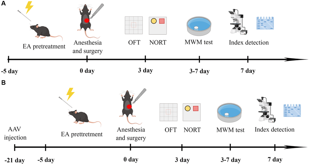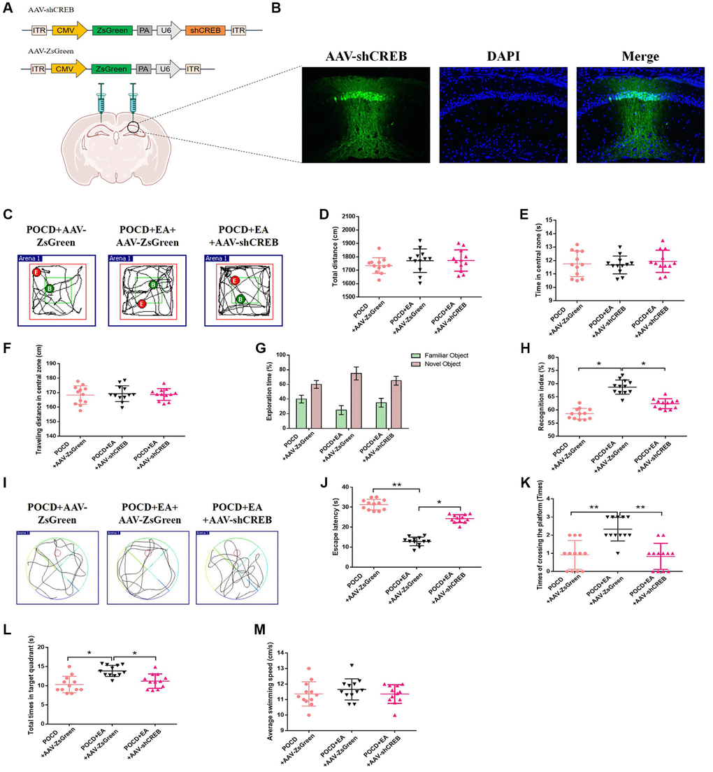 In the following experiment, mice were divided into three groups (n = 12): POCD+AAV-ZsGreen, POCD+AAV-ZsGreen+EA and POCD+EA+AAV-shCREB respectively. The schematic diagram of the experimental procedure is shown in Figure 1B.