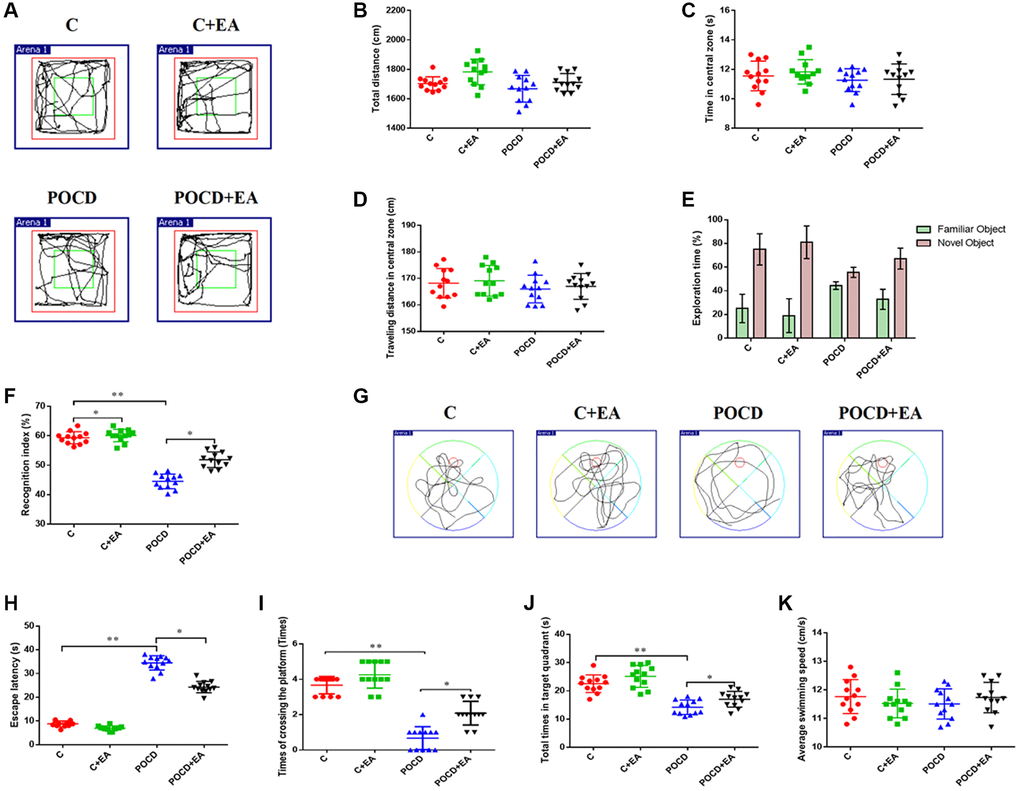 The NORT and MWM tests were used to evaluate learning and memory abilities. Notably, the recognition index was higher in the C and POCD+EA group compared with the POCD group. There was no significant differences between group C and C+EA (Figure 2E, 2F). In the MWM test, the escape latency was shorter and the number of crossings of the platform area and the total time spent in the target quadrant were higher in the C+Y group compared with group C. The escape latency was higher and the number of crossings of the platform area and the total time spent in the target quadrant were lower in the C and POCD+EA group compared with the POCD group. There was no significant differences between C and C+EA group (Figure 2G–2J). There were no significant differences in swimming speed among the four groups (Figure 2K).
