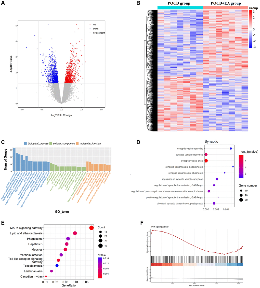 As a first step towards revealing whether EA pretreatment plays a role in aged rats with POCD, we examined differences in RNA-seq gene expression profiles in the hippocampal CA1 region between the POCD and POCD+EA group. Among the DEGs, 353 were upregulated and 563 were downregulated. DEG volcano maps were created using the ggplot2 package in R software (Figure 3A), and DEG cluster analysis heatmaps were drawn using the R software package, pheatmap (Figure 3B). In accordance with the GO pathway diagram, DEGs were enriched for “regulation of membrane potential” “neuron to neuron synapse” and “protein serine/threonine kinase activity” (Figure 3C) and synapse-related GO terms such as synaptic vesicle recycling, synaptic vesicle exocytosis and synaptic vesicle cycle were significantly enriched (Figure 3D). KEGG pathway analysis indicated significant enrichment of 330 signaling pathways. According to the KEGG pathway map, “MAPK signaling pathway”, “Lipid and atherosclerosis”, “Phagosome”, “Hepatitis” and “Measles” were the top five enriched pathways (Figure 3E). Additionally, GSEA revealed significant enrichment of the MAPK signaling pathway (enrichment score: 0.62, p = 0.002; Figure 3F).