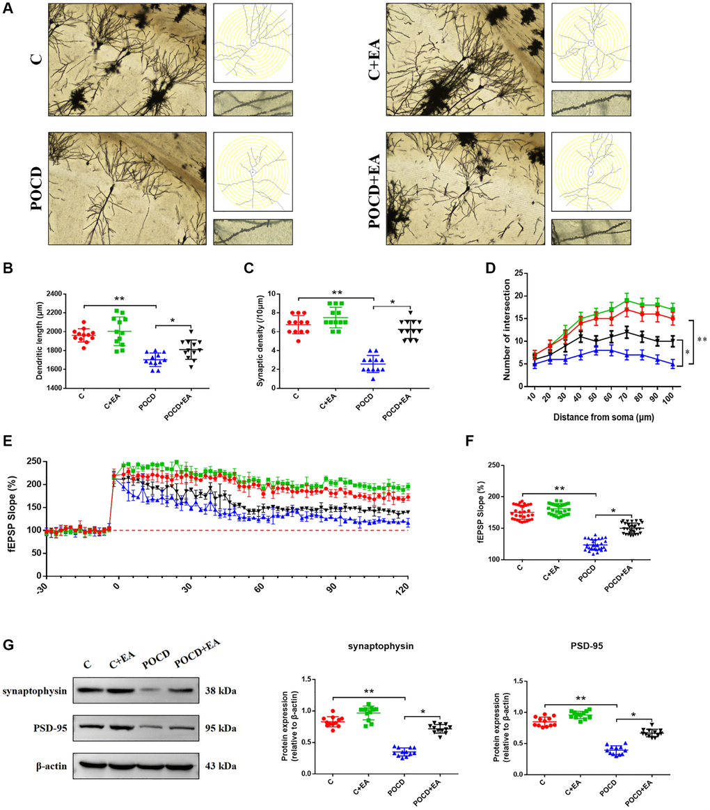 To further investigate memory function, we stained the hippocampal CA1 region by Golgi staining to observe changes in synaptic structure (Figure 4A). The dendritic length (Figure 4B), synaptic spine density (Figure 4C), number of intersections of dendrites (Figure 4D), LTP (Figure 4E, 4F) and expression level of synaptophysin and PSD-95 (Figure 4G) in the CA1 region were higher in C group compared with the POCD group. Notably, EA pretreatment prevented the reductions in dendritic length (Figure 4B), synaptic spine density (Figure 4C), number of intersections of dendrites (Figure 4D), LTP (Figure 4E, 4F) and expression level of synaptophysin and PSD-95 (Figure 4G) in the POCD+EA group. There was no significant differences between group C and C+EA.