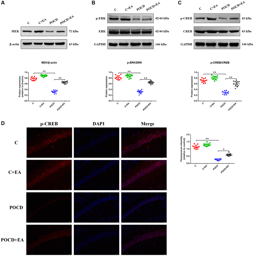 CREB plays a key role in improving synaptic plasticity by activating the MAPK/ERK signaling pathway [27]. Thus, we hypothesized that it might also alleviate POCD in aged rats following pretreatment with EA. To test this, we analyzed the expression of MEK, ERK, p-ERK, CREB and p-CREB by western blotting. The expression levels of MEK (Figure 5A), p-ERK (Figure 5B) and p-CREB (Figure 5C) were significantly downregulated in the hippocampus of rats in the POCD group compared with the C group. The expression levels of MEK, p-ERK and p-CREB were upregulated in the POCD+EA group compared with the POCD group (Figure 5A–5C). However, the expression levels of ERK and CREB did not differ among the four groups. There was no significant differences between group C and C+EA (Figure 5A–5C). Immunostaining for p-CREB, which is downstream of the MAPK/ERK/CREB signaling pathway, revealed that the intranuclear expression of the transcription factor in the hippocampus was lower in the POCD group compared with the C group, whereas it was higher in the POCD+EA group than in the POCD group. There was no significant differences between group C and C+EA (Figure 5D).
