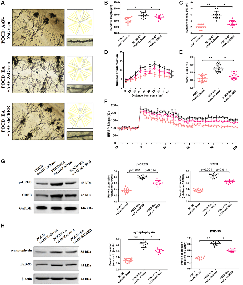 To gain mechanistic insight, we generated AAVs to downregulate CREB. Compared with the POCD+AAV-ZsGreen+EA group, cognitive function was significantly declined in the POCD+EA+AAV-shCREB group. Golgi staining and neurophysiological recordings were then used to investigate structural and functional synaptic plasticity. The density and number of dendritic spines and the amplitude of LTP in the POCD+EA+AAV-shCREB group were significantly decreased. These results indicate that the EA improves anesthesia and surgery-induced cognitive impairment through activation of the MAPK/ERK/CREB pathway in hippocampal neurons improves synaptic function.