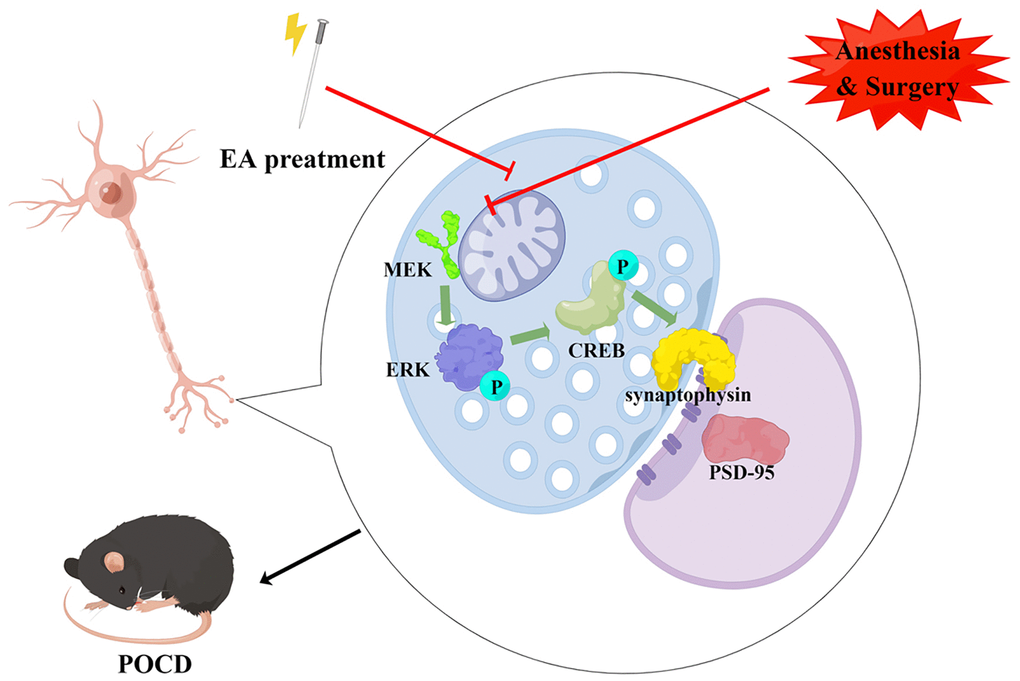 Our findings show that anesthesia/surgery in aged rats leads to hippocampal-dependent cognitive dysfunction. Impaired synaptic plasticity is an important mechanism in POCD. EA pretreatment alleviates anesthesia/surgery-induced cognitive decline in aged rats by ameliorating synaptic plasticity via activation of the MAPK/ERK/CREB pathway. EA pretreatment may therefore have clinical potential in the prevention of POCD.