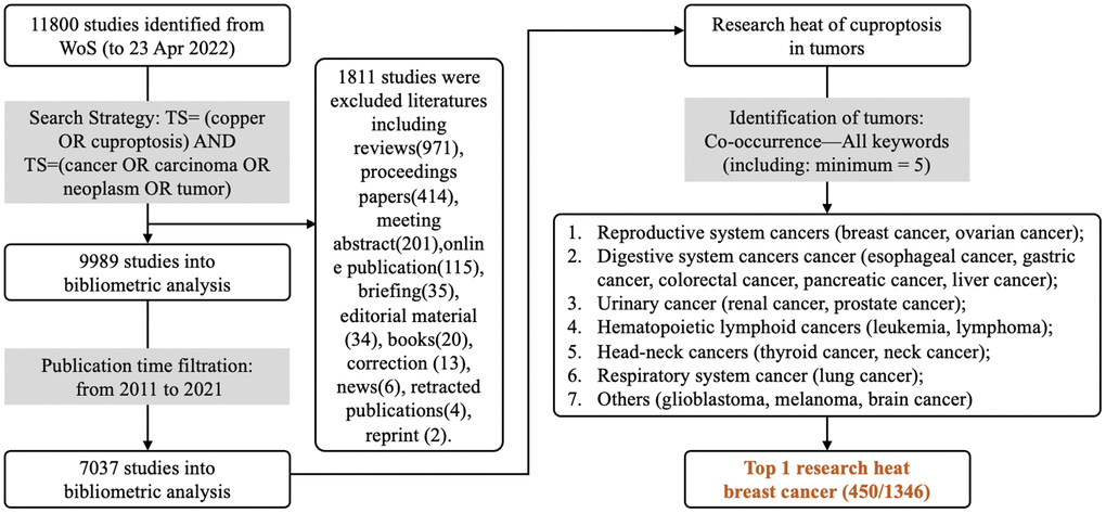 Web of Science (WOS) is used to collect copper(II)-related publications until April 23, 2022. The search strategy is as follows: TS= (copper OR cuproptosis) AND TS= (cancer OR carcinoma OR neoplasm OR tumor). 11800 pieces of literature are obtained, including articles (n=9989) and non-articles (reviews, proceeding papers, or others, n=1811) (Figure 1). After screening studies published between 2011 to 2021, 7037 studies are finally included.