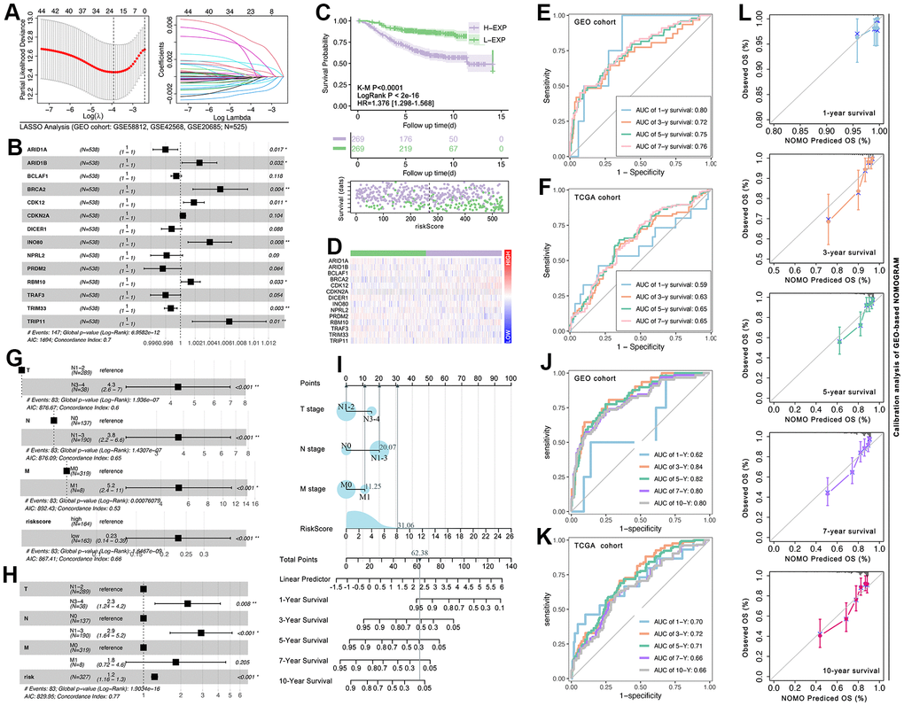 Firstly, LASSO analysis is performed to narrow the number of selected CRG-TDGs (Figure 10A). Then multivariate cox regression is performed to construct a multi-genes risk model, and the results display that the C-index of the risk model is 0.7 (p=6.95832e-12, Figure 10B). K-M and univariate cox regression analysis show that risk model identifies hierarchical prognosis risk (HR=1.376[1.298-1.568], log-rank p<2e-16, K-M p<0.0001, Figure 10C). Gene expression feature is also displayed (Figure 10D). In order to assess the prediction efficiency of risk model, receiver operating characteristic curve (ROC) is performed, and results show that the AUC value of 1-year survival, 3-year survival, 5-year survival, and 7-year survival is 0.80, 0.72, 0.75, and 0.76 in GEO cohort, while it is 0.59, 0.63, 0.65 and 0.65 in TCGA cohort (Figure 10E, 10F). To further develop the nomogram, clinical characteristics are put into analysis. As Figure 10G shows, the N stage, T stage, and M stage are all risk factors in breast cancer (p<0.001, Figure 10G). Therefore, the N stage, T stage, M stage, and risk-score are selected to construct a new nomogram (C-index=0.77, p=1.9034e-16, Figure 10H), which is displayed in Figure 10I. And ROC analysis shows that the AUC value of 1-year survival, 3-year survival, 5-year survival, 7-year survival, and 10-year survival is 0.62, 0.84, 0.82, 0.80, and 0.80 in the GEO cohort, while it is 0.70, 0.72, 0.71, 0.66 and 0.66 in the TCGA cohort (Figure 10J, 10K). Finally, calibration analysis is performed, and the results show that GEO-based NOMOGRAM has appreciable efficiency in predicting breast cancer prognosis (Figure 10L).