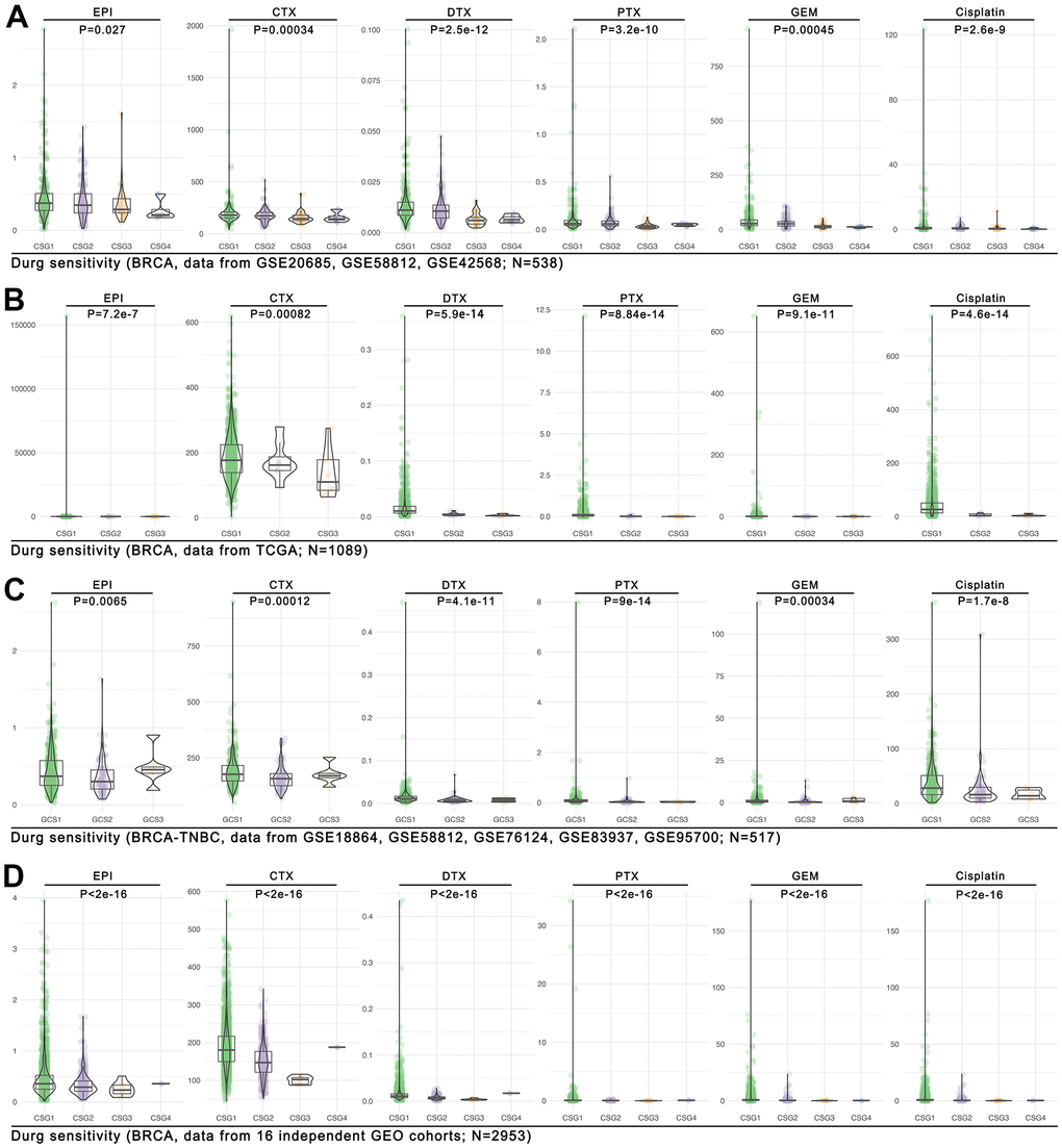 To our knowledge, tumor immune cell infiltration is reported to be involved in tumor drug therapy sensitivity. Here, we find CRG subgroup division identified different tumor immunizations, including NK cell infiltration, T cell infiltration, macrophage cell infiltration, et al. (Figure 9F). Therefore, the CRG subgroup division may be linked to drug sensitivity. We use the OncoPredict package in R4.2.0 to assess the drug score in each single breast cancer sample. As the Figure 11A shows, the trend of different drugs score is almost similar in the GEO breast cancer cohort (n=538, p<0.05, Figure 11A). In the TCGA breast cancer cohort (n=1089), the same trend of the drug score is observed (p<0.001, Figure 11B), while in the TNBC cohort (from GEO, n=517), we find a same trend of the drug score in DTX, PTX, GEM, and Cisplatin (p<0.001, Figure 11C). In the following further verification cohort (combined with 16 independent GEO breast cancer cohorts, n=2953), we find the trend of the drug score is also similar (p<2e-16, Figure 11D).