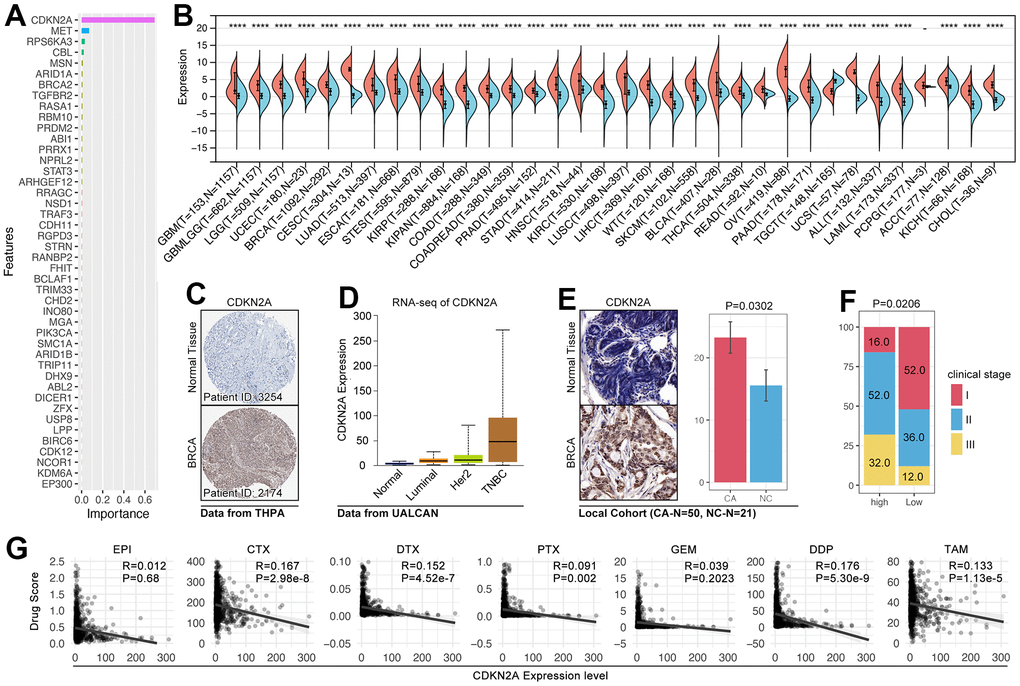 In order to identify the pivotal genes in regulating CRG subgroup division and tumor-immunity-mediated drug sensitivity change, an importance analysis is performed, and it shows CDKN2A is the most important gene (Figure 12A). As previous studies reported, CDKN2A-mediated molecular subtypes identified drug sensitivity differences in afatinib, erlotinib, and lapatinib, and the higher expression of CDKN2A implied worse outcomes and molecular subtypes in breast cancer. In fact, CDKN2A overexpressed in 33 of 34 types of cancers, including breast cancer (Figure 12B). In order to further verify this phenotype, we collected IHC data from THPA (The Human Protein Atlas, https://www.proteinatlas.org), and the results show that CDKN2A is higher expressed in breast cancer tissues (Figure 12C). In metastasis breast cancer cohort, we find CDKN2A also overexpressed in breast cancer tissues, especially in malignant subtypes (TNBC) (Figure 12D). Collectively, in local breast cancer cohort, we found CDKN2A also overexpress in breast cancer tissues (Figure 12E and Table 3). Meantime, patients with the higher expression level of CDKN2A accompanied with worse clinical stage (p= 0.0206, Table 3). However, although above results implied CDKN2A is an oncogene in breast cancer, the expression level of CDKN2A is negatively related with drug score (CTX, DTX, PTX, DDP, and TAM) (Figure 12G).