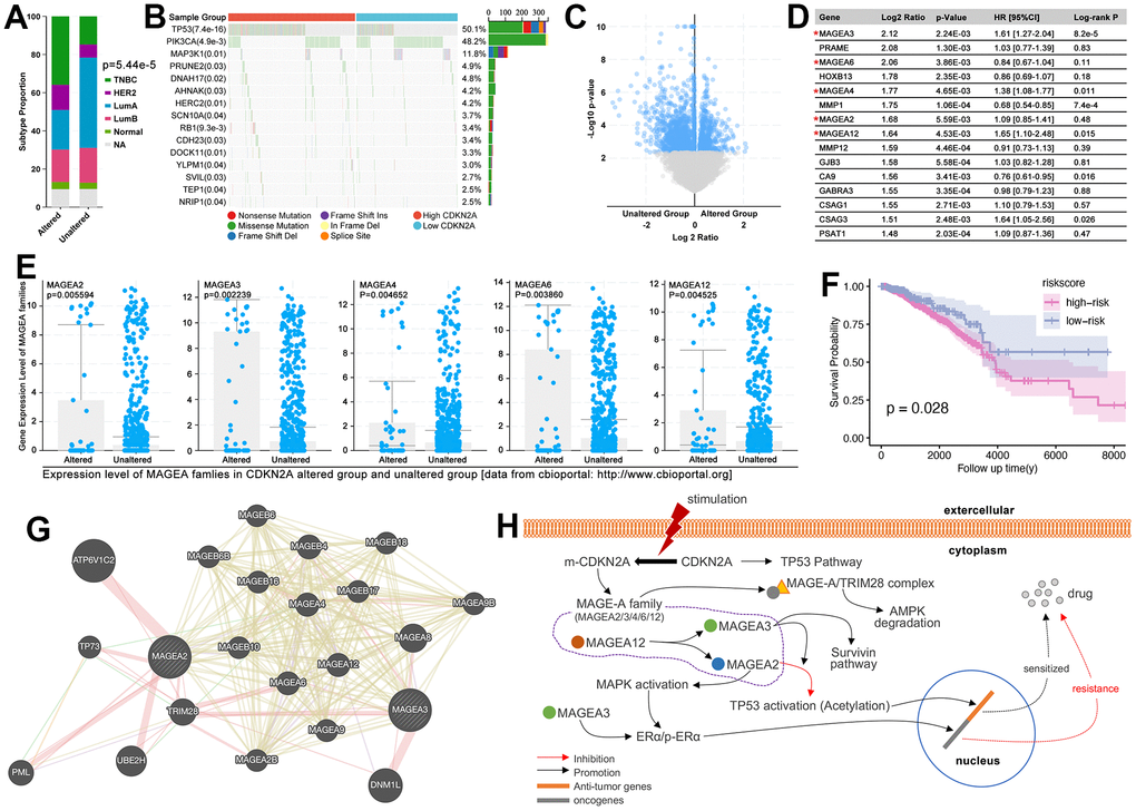 To our knowledge, CDKN2A is a cell cycle inhibitor, and it participated P53 pathway to regulate cell apoptosis and drug sensitivity [24]. However, as an anti-tumor factor, CDKN2A is up-regulated in various types of cancers (31 types of cancers, Figure 12B). As previous studies show, a high expression level of CDKN2A accompanied by the high level of methylation of itself, and the latter one is related with the high level of DNA hypermethylation, which promoted initiation of oncogenesis [25]. Except for epigenetic changes-mediated oncogenesis of CDKN2A, CDKN2A mutation-mediated drug resistance is also needed to be explored in oncogenesis and drug resistance. As the Figure 13A shows, the alteration of CDKN2A implies malignant type (TNBC) of breast cancer, while the unalteration of CDKN2A implies mild subtype (LumA) of breast cancer (p= 5.44e-5, Figure 13A). To further explore the mechanism of CDKN2A-mediated oncogenesis, we explore the expression level of CDKN2A in regulating genomic alteration. As results showed, the higher mutation level of P53 appears in the CDKN2A overexpression group (p=7.4e-16, Figure 13B). Following, we explore gene expression features in the CDKN2A mutation group. As the results showed, among the top ten genes with the most obvious expression change, the MAGE-A family gets our attention. MAGEA2, MAGEA3, MAGEA4, MAGEA6, and MAGEA12 are up-regulated in the CDKN2A alteration group, amongst which MAGEA3 (HR=1.61[1.27-2.04], p=8.2e-5), MAGEA4 (HR=1.38[1.08-1.77], p=0.011), and MAGEA12 (HR=1.65[1.10-2.48], p=0.015) are accompanied by worse prognosis in breast cancer (Figure 13C–13E). Then, MAGEA2, MAGEA3, MAGEA4, MAGEA6, and MAGEA12 are used to construct a multi-gene risk model, which shows higher risk is accompanied by worse prognosis (p=0.028, Figure 13F).