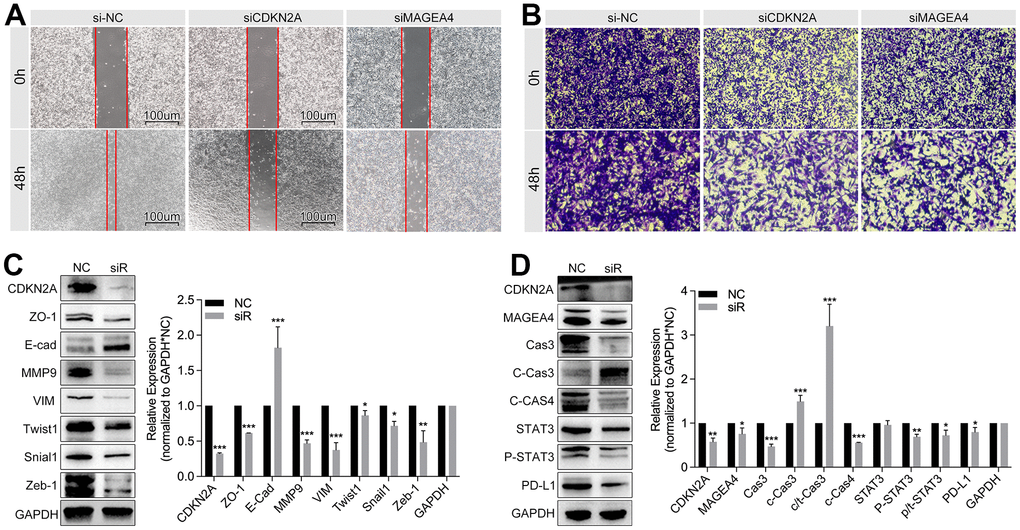 In order to verify the regulation effects of CDKN2A/MAGEA4 in breast cancer progression, in vitro experiments are performed. As Figure 14A, 14B show, down-regulation of CDKN2A or MAGEA4 inhibits cell migration in wound healing assay and transwell assay. To further uncover the potential molecular mechanisms, small interfere RNA (siRNA) is used to decrease the expression of CDKN2A in TNBC cell lines. As the Figure 14C shows, down-regulation of CDKN2A decreases the expression of EMT markers, such as Snail1, Zeb1, Twist1 and MMP9, while E-cad is up-regulated. In Figure 14D, down-regulation of CDKN2A decreases the expression of phosphorylated STAT3, MAGEA4, Caspase3 and PD-L1, while cleaved-csapase3 is increased.