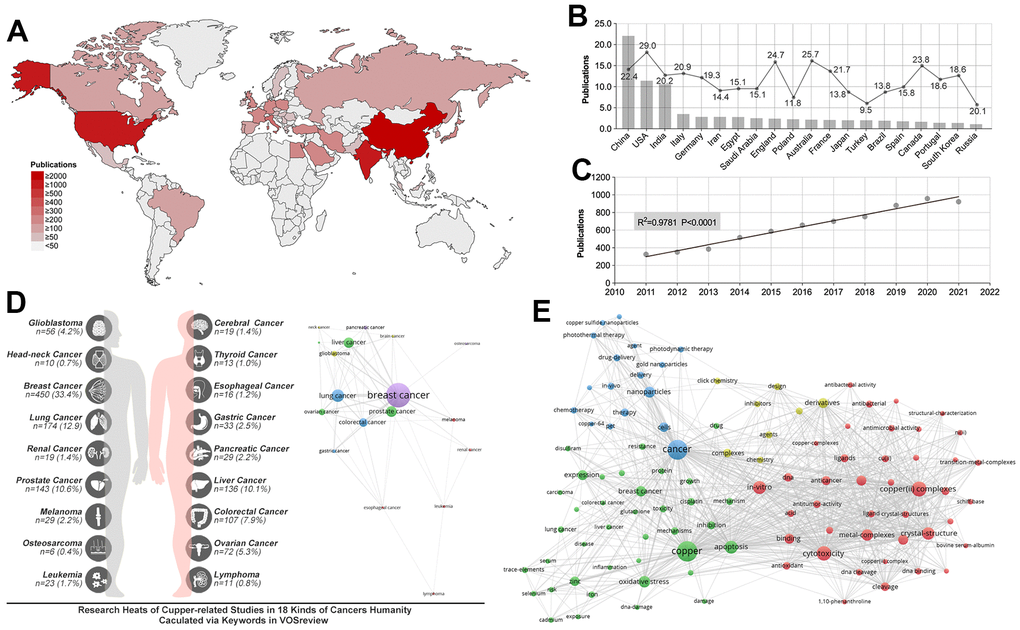 The number of publications (NP) and the number of citations (NCs) are used for calculating the mean number of citations (MNCs). The relationship between NPs and time (year) is analyzed via simple linear regression in Statistical Product Service Solutions 20.0 (SPSS 20.0) and plotted by GraphPad Prism 7.0. The worldwide distribution map of the NPs is plotted in R4.2.0 (packages: maps, ggplot). The entry frequency threshold of the keyword is 50, and the entry frequency threshold of the journal is 20. The tumor distribution of copper(II) is calculated based on the frequency of the tumor name and the applied cell line mentioned in the keywords and plotted by VOS viewer 16.0. In addition, the keyword distribution is also plotted by VOS viewer 16.0.