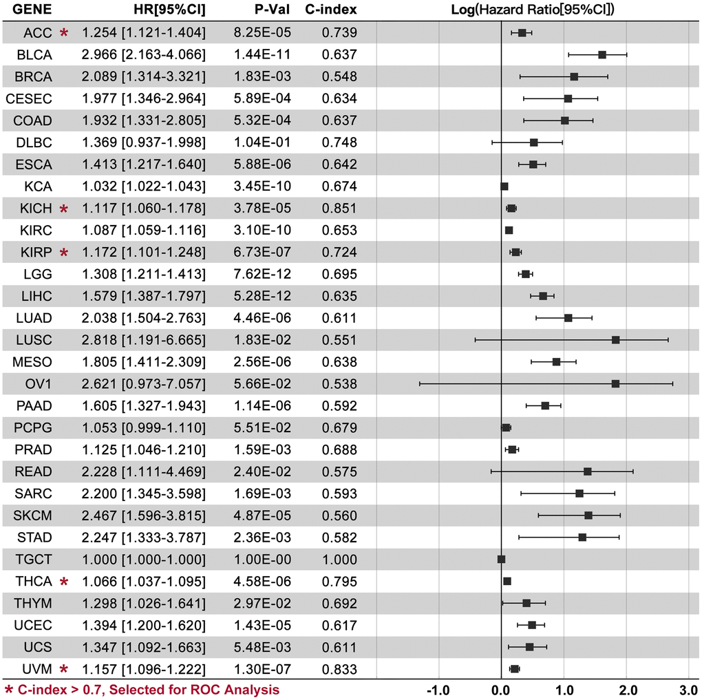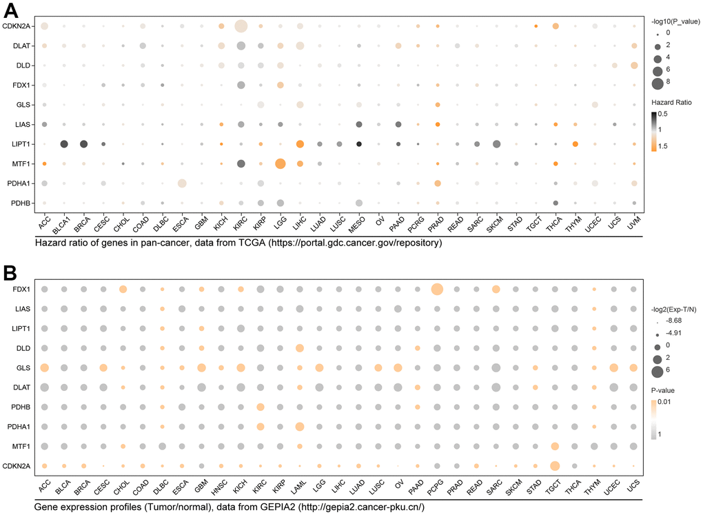 To learn the effects of CRCGs in cancers, we explored the expression features and prognosis hazard ratio (HR) in pan-cancer. As the results show in Figure 3A, CDKN2A has prognostic significance in 6 types of cancer (ACC, COAD, KICH, KIRC, LIHC, THCA, UCEC), and DLAT, DLD, FDX1, GLS, LIAS, LIPT1, MTF1, PDHA1 and PDHB have different prognosis significance in pan-cancer (Figure 3A). ANOVA analysis result of differential expression levels in pan-cancer performed in GEPIA2 are shown in Figure 3B, with a threshold of p<0.01 and logFC≥1.