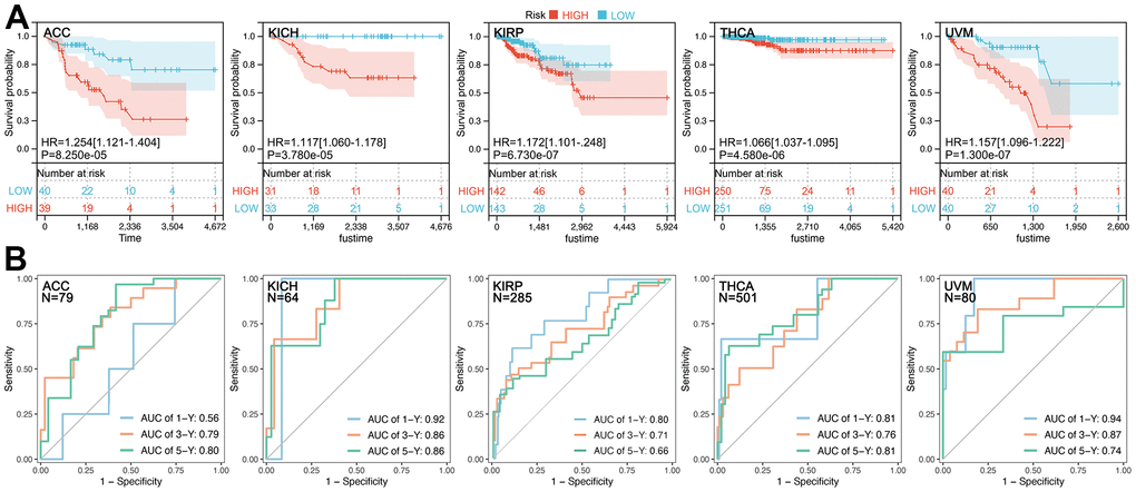 CRGs-based Multi-gene Risk-score (CRGScore) is not significant in DLBC, OV, PCPG, and TGCT (Figure 4, P>0.05), while a relatively good performance of the CRGScore is observed in ACC (C-index=0.739, P=8.25e-05), KICH (C-index=0.851, P=3.78e-05), KIRP (C-index=0.724, P=6.73e-07), THCA (C-index=0.795, P=4.58e-06), and UVM (C-index=0.833, P=1.30e-07). Moreover, different CRGs are used to construct the risk-score model in ACC (CDKN2A, DLAT, and PDHA1), KICH (CDKN2A, DLD, GLS, LIPTA, and PDHA1), KIRP (DLAT, GLS, and PDHA1), THCA (CDKN2A, DLD, LIAS, PDHA1, and PDHB), and UVM (DLD, LIAS, MTF1, and PDHB). Kaplan-Meier (K-M) analysis shows that a higher CRGScore predicts a worse prognosis in ACC, KICH, KIRP, THCA, and UVM (Figure 5A). Besides, ROC analysis assessed the efficiency of CRCGScore in predicting prognosis. The results show that ROC values for survival at 1, 3, and 5 years are 0.56, 0.79, and 0.80 in ACC, 0.92, 0.86, and 0.86 in KICH, 0.80, 0.71, and 0.66 in KIRP, 0.81, 0.76, and 0.81 in THCA and 0.94, 0.87, and 0.74 in UVM, respectively (Figure 5B).