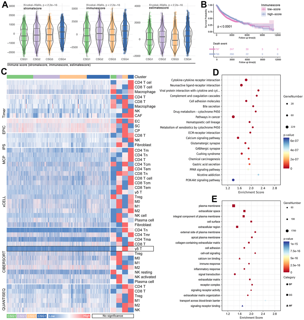 The results display that four groups are the best division strategy (Figure 6A, 6B), and the clustering is observed obviously (Figure 6C, 6D). Besides, the proportion of pan-cancer in each subgroup is significantly different (Figure 6E). At the same time, the proportion of subgroups in different single tumor types is also different (Figure 6F). Then, features of CRG subgroups are explored. As the Figure 7A shows, CSG4 holds highest score of stromalscore, immunescore and estimatescore (p<2.2e-16, Figure 7A). Kaplan-Meier analysis shows higher immunescore with better prognosis (p<0.0001, Figure 7B). Following, immune cells infiltration in tumor tissues is explored, and the results showed that immune cells are differently infiltrate in four CRG subgroups (Figure 7C). Then, CRGs-related genes are put into KEGG and GO analysis to further unclear the roles of cuproptosis in regulating tumor immunity. As the results show, CRGs-related genes are involved in Drug Metabolism, Cytokine-cytokine Receptor Interaction, Immune Response, and Inflammatory Response, et al. (Figure 7D, 7E). Both of the above molecular pathway analyses imply that cuproptosis is related with tumor immunity.